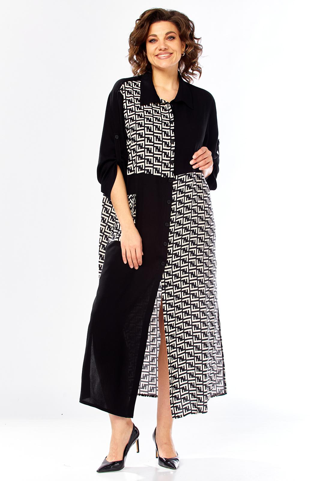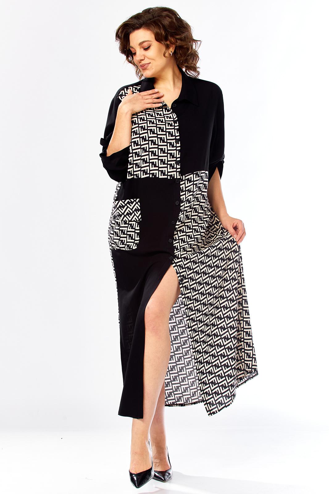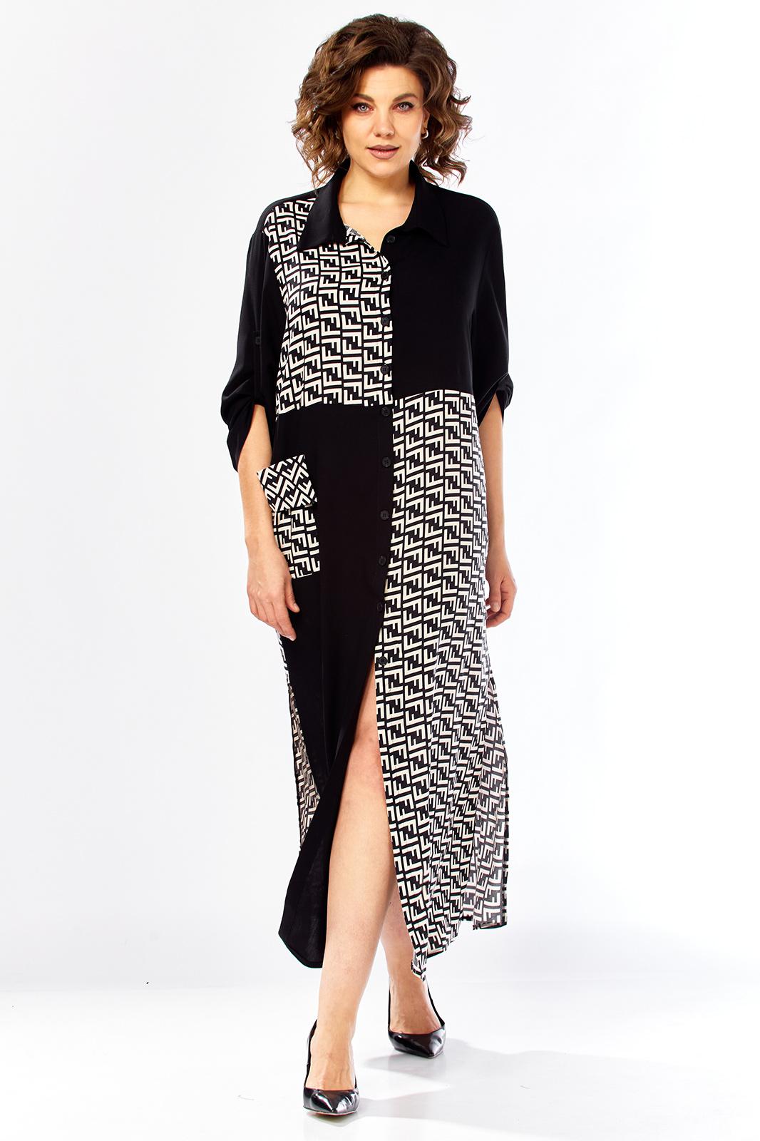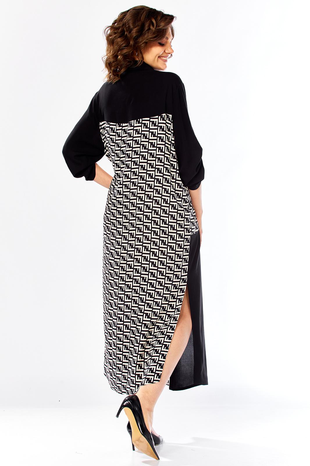 Платье женское свободного кроя с центральной застежкой на петли и пугоцы. Спинка окрглой формы. Перед с подрезом на талии. Платье из 2-ух видов ткани, расположенных в шахматном порядке. На правой половине боковой накладной карман с клапаном. Воротник рубашечный на стойке. Рукав втачной одношовный длиной 7/8 с хлястиком с возможностью регулировки длины. Длина по спинке 129 см. Длина рукава 49 см.
