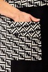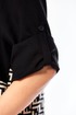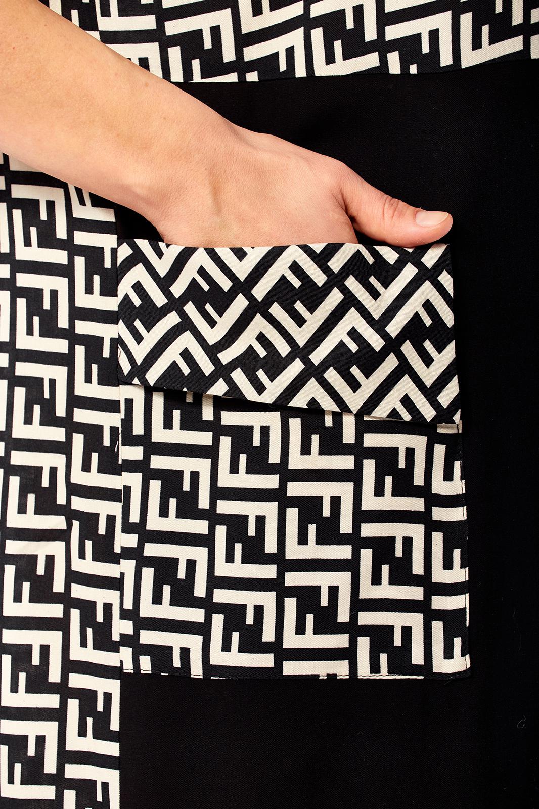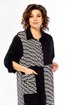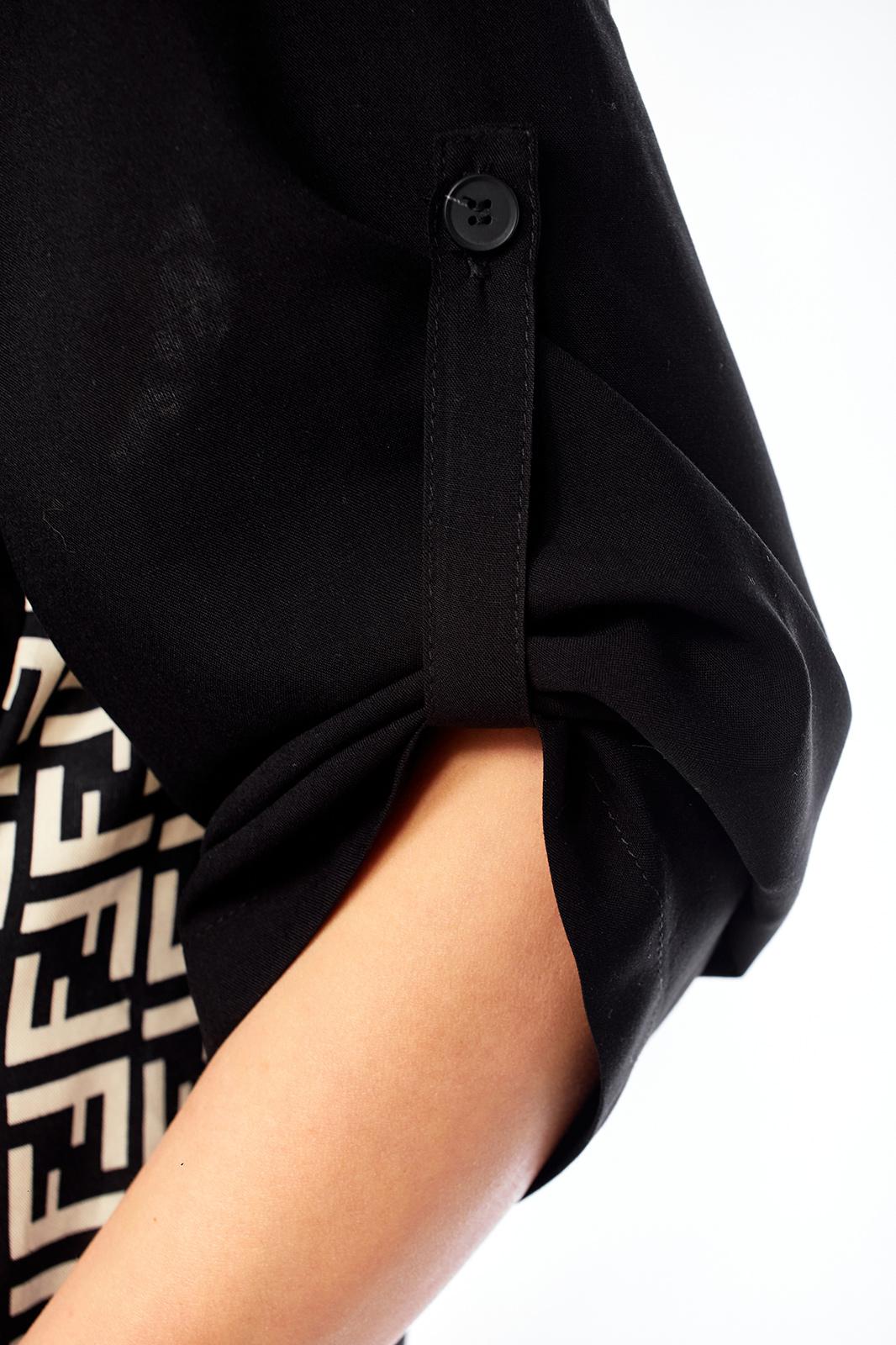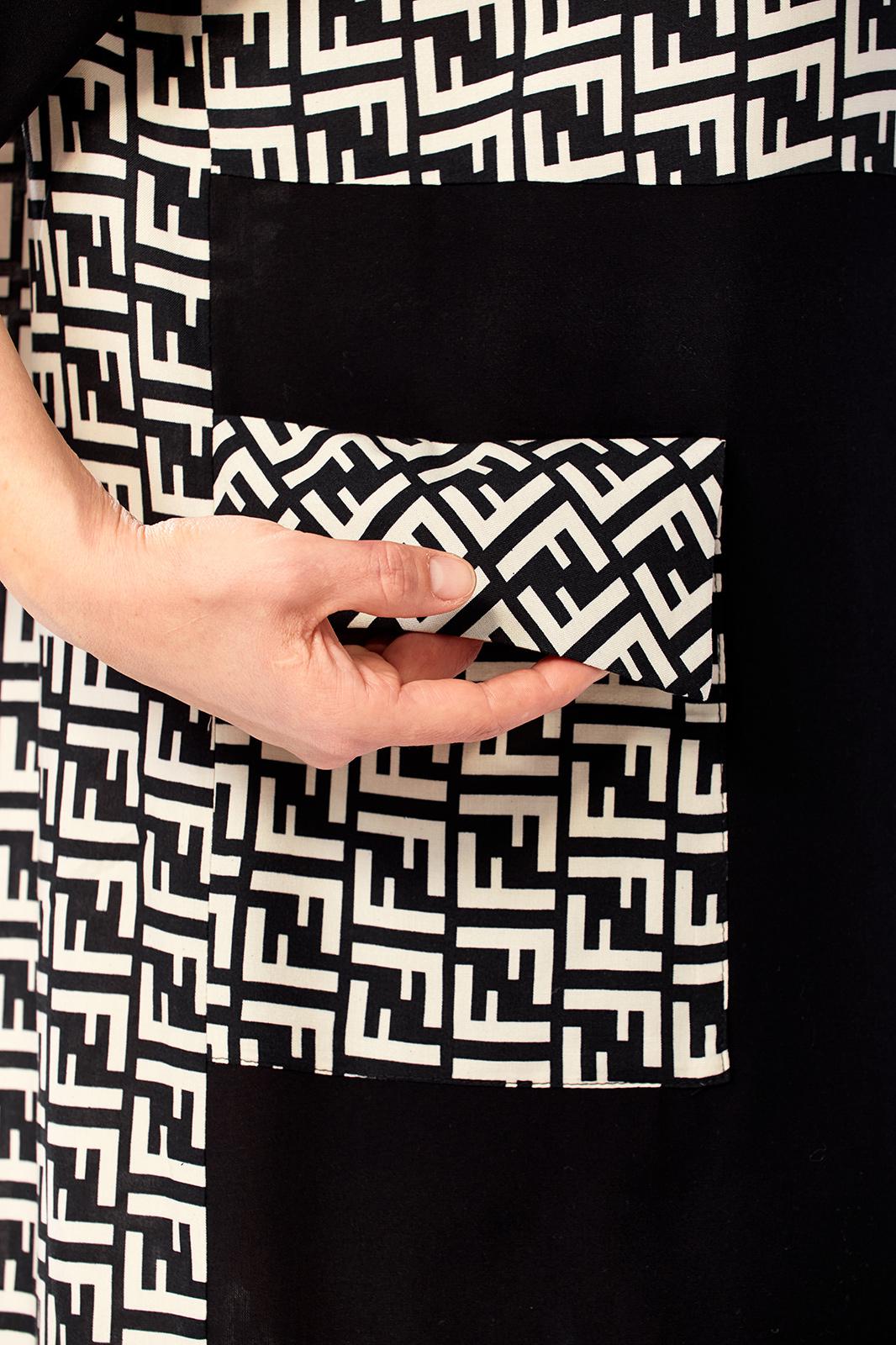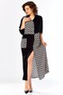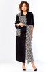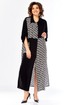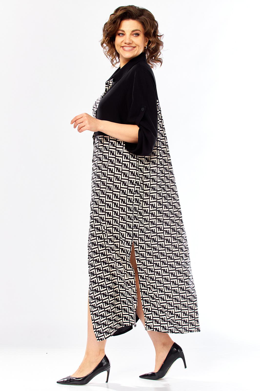 Платье женское свободного кроя с центральной застежкой на петли и пугоцы. Спинка окрглой формы. Перед с подрезом на талии. Платье из 2-ух видов ткани, расположенных в шахматном порядке. На правой половине боковой накладной карман с клапаном. Воротник рубашечный на стойке. Рукав втачной одношовный длиной 7/8 с хлястиком с возможностью регулировки длины. Длина по спинке 129 см. Длина рукава 49 см.