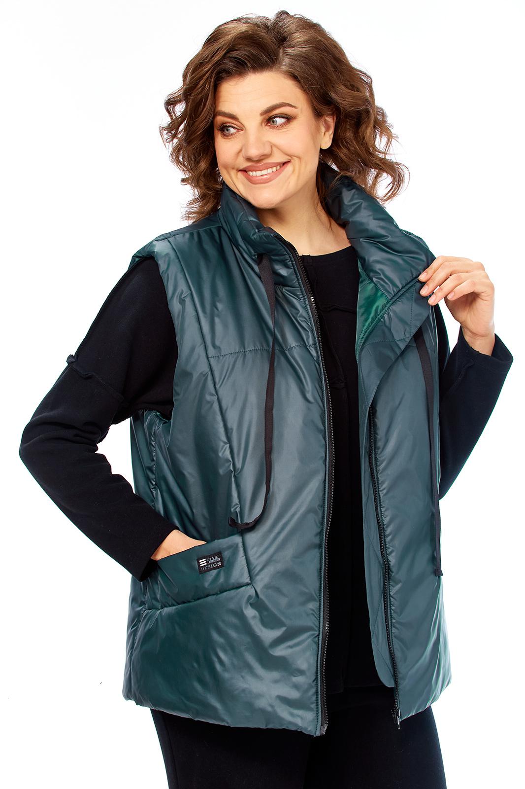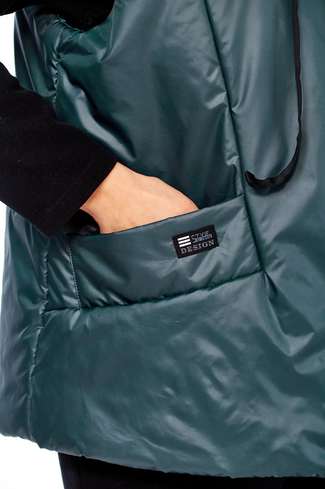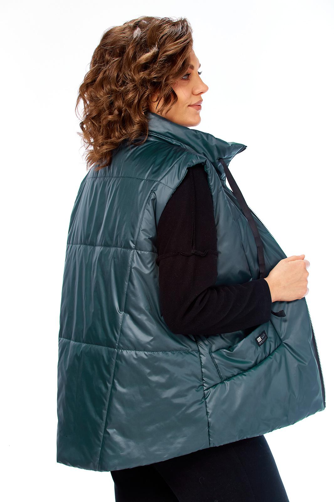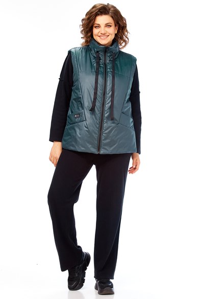 Жилетка женская утепленная с центральной застежкой на молнию. Спинка со стяжкой. Перед с отрезными бочками и боковыми карманами с листочкой. Воротник стойка с кулисой и шнуром из декорированной тесьмы. Низ жилетки округлой формы спереди короче, а спинка длиннее . Правый карман украшен нашивкой. Длина изделия по спинке 73-74 см.