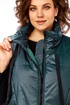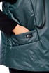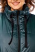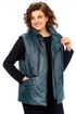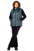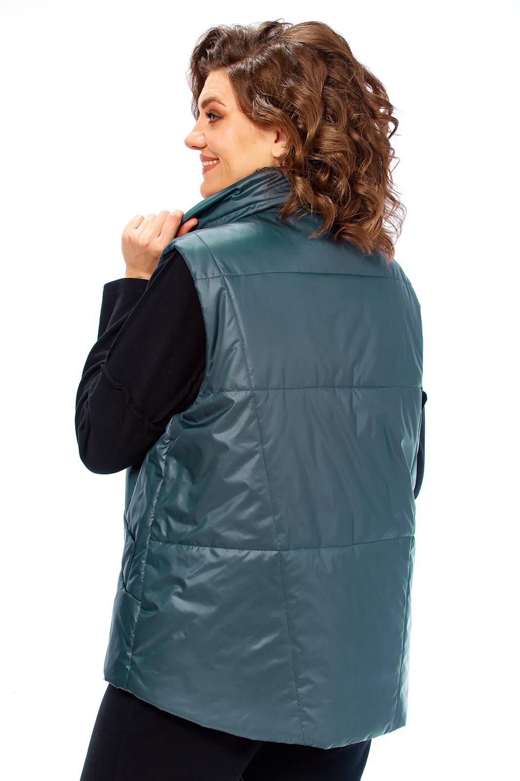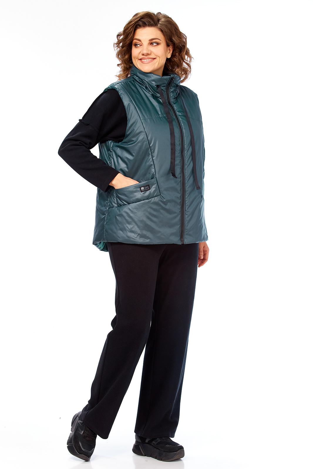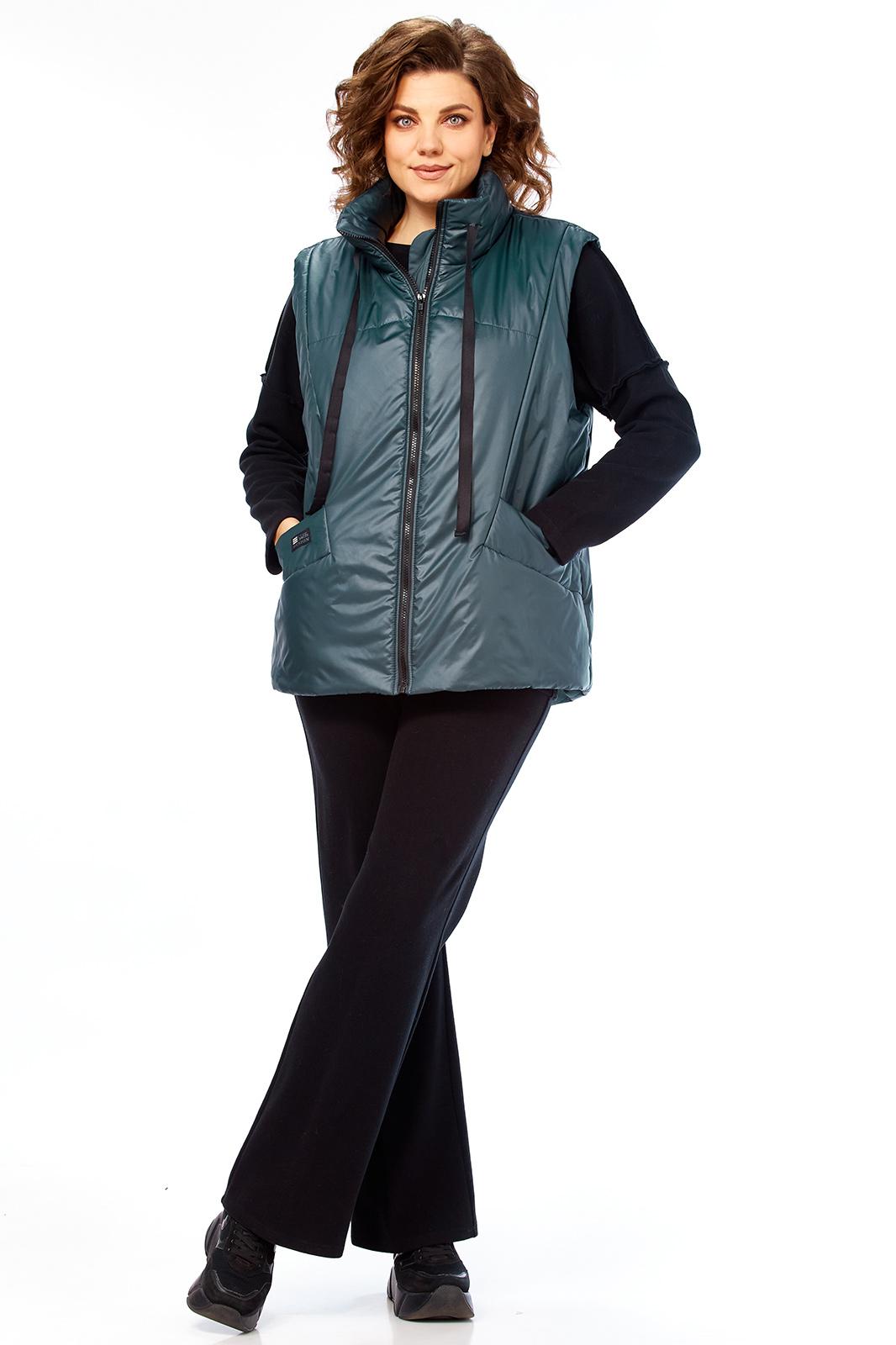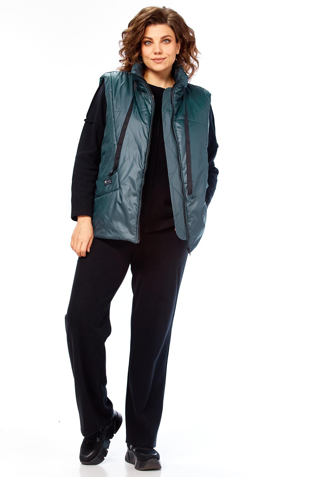 Жилетка женская утепленная с центральной застежкой на молнию. Спинка со стяжкой. Перед с отрезными бочками и боковыми карманами с листочкой. Воротник стойка с кулисой и шнуром из декорированной тесьмы. Низ жилетки округлой формы спереди короче, а спинка длиннее . Правый карман украшен нашивкой. Длина изделия по спинке 73-74 см.