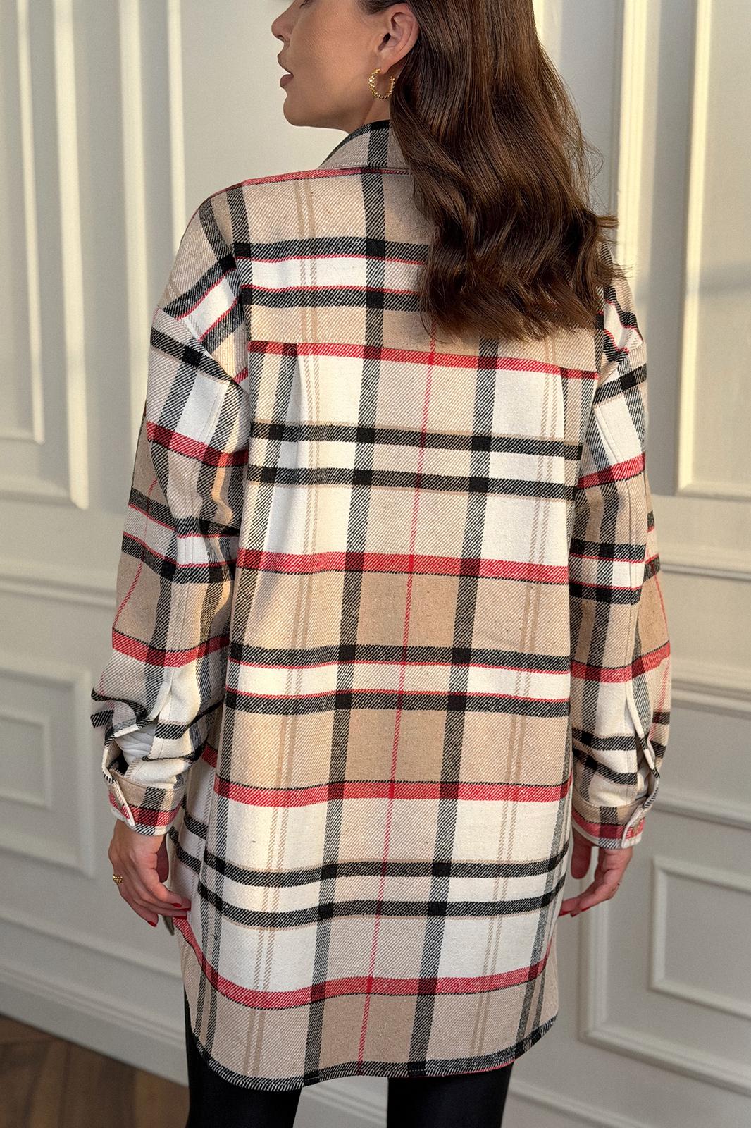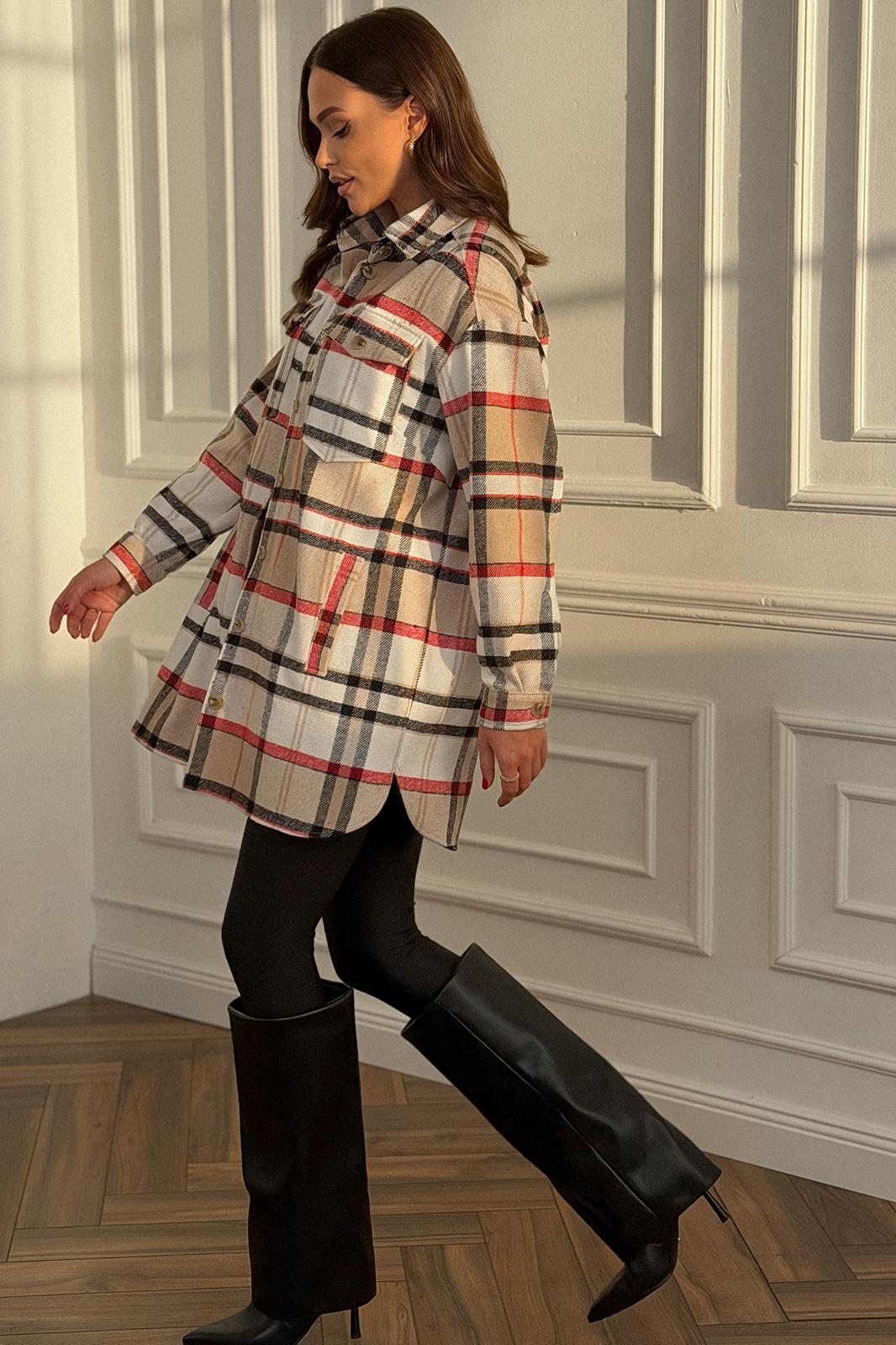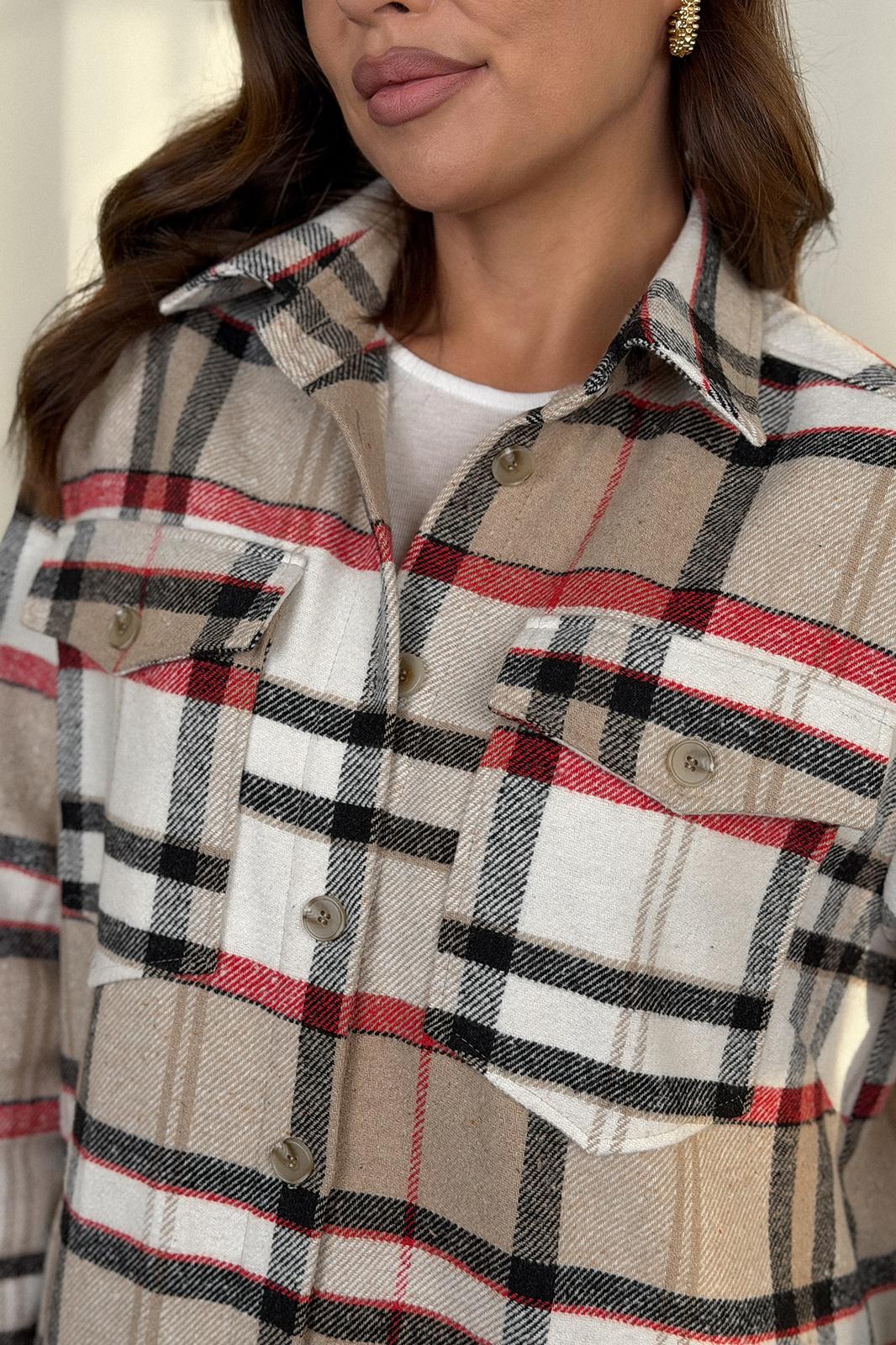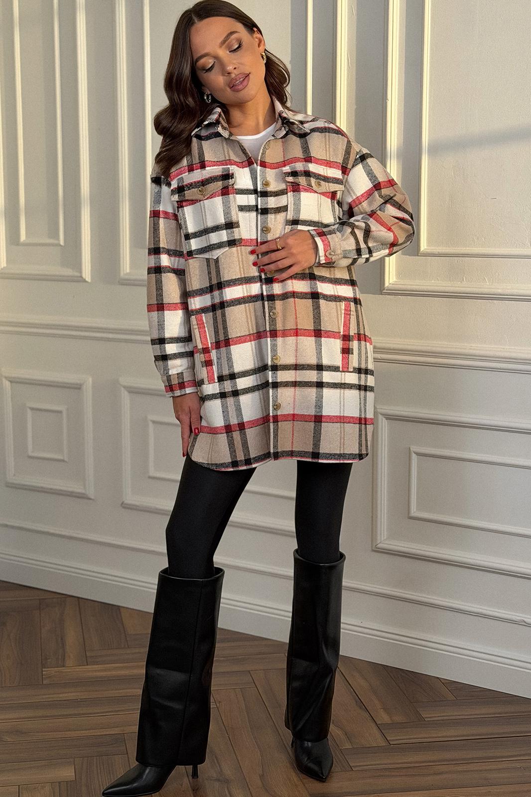 Рубашка женская, прямого свободного силуэта, со спущенной линией плечевого шва. Рубашка длинной ниже линии бедер. Спинка с отрезной кокеткой и двумя односторонними складками на нижней детали. Перед с нагрудными вытачками из бокового шва, застежкой-цельнокроенная планка на 7 петель-пуговиц. По переду настрочены нагрудные накладные карманы с клапаном, а также обработаны карманы с листочкой, концы настрочные. Низ рубашки фигурной формы с разрезами по бокам. Рукава втачные, двух шовные, с разрезом по верхнему шву. Низ на притачной манжете, застегивается на пуговицу. Воротник стояче-отложной на отрезной стойке.
