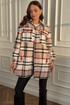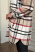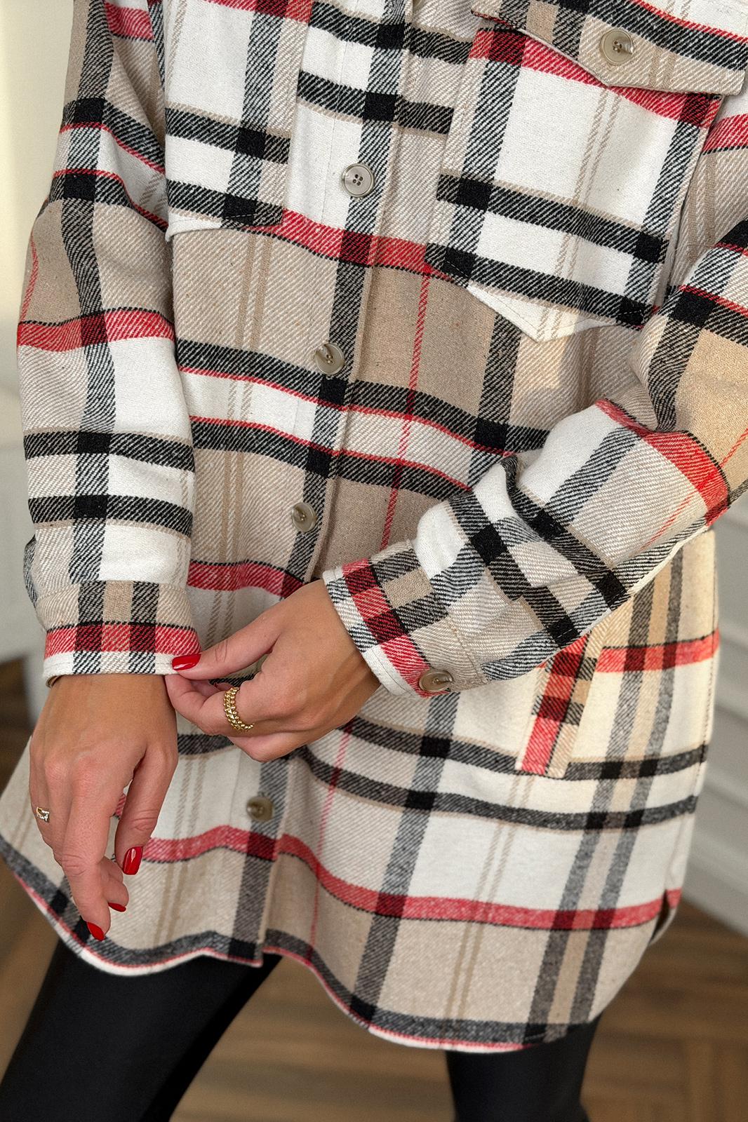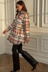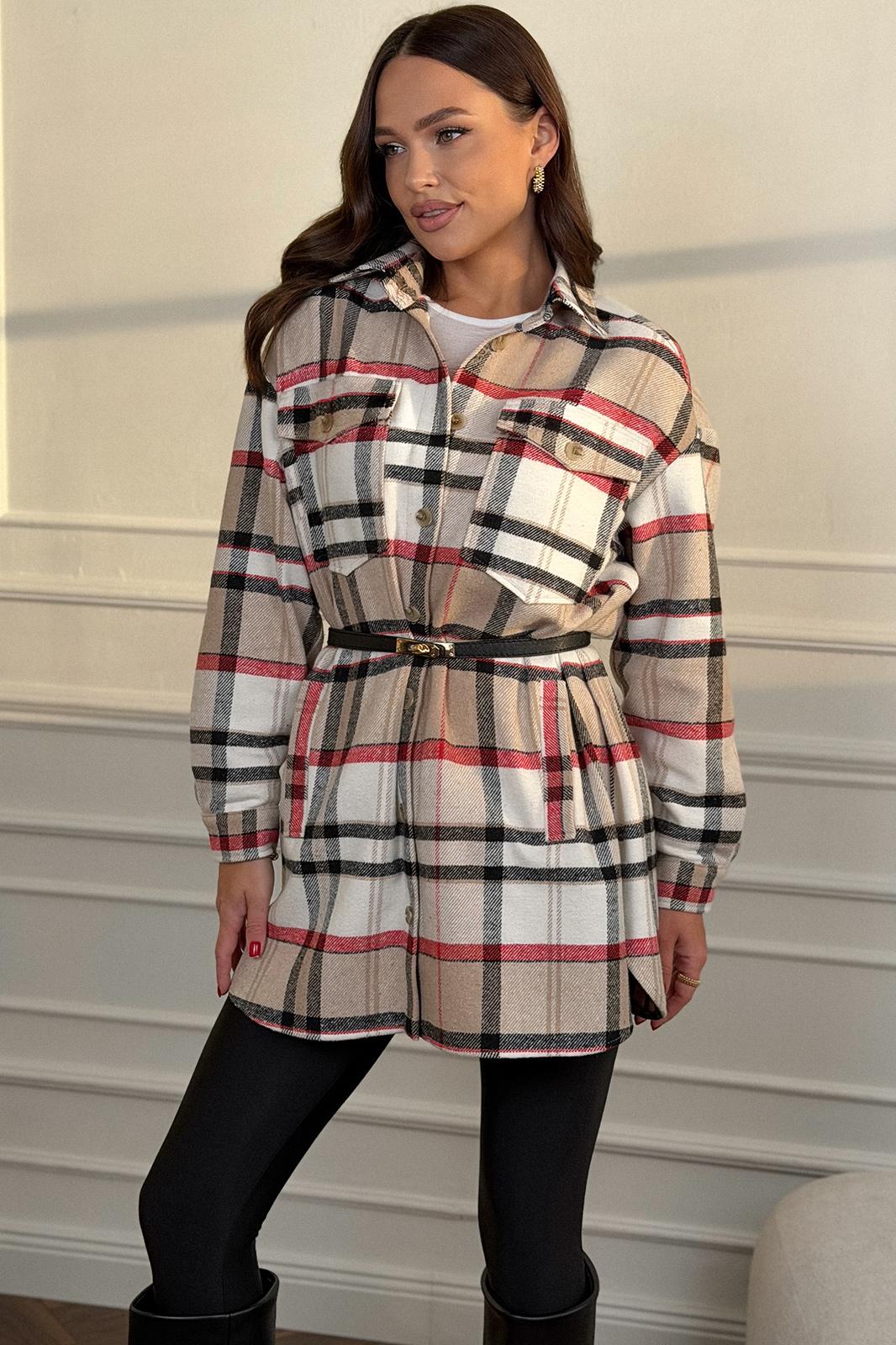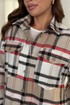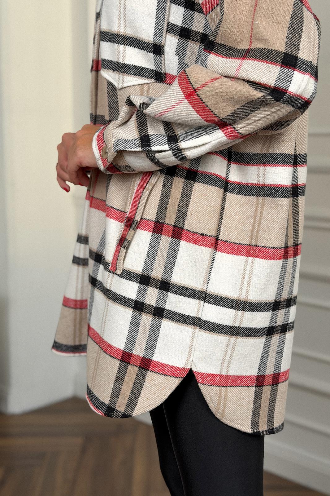 Рубашка женская, прямого свободного силуэта, со спущенной линией плечевого шва. Рубашка длинной ниже линии бедер. Спинка с отрезной кокеткой и двумя односторонними складками на нижней детали. Перед с нагрудными вытачками из бокового шва, застежкой-цельнокроенная планка на 7 петель-пуговиц. По переду настрочены нагрудные накладные карманы с клапаном, а также обработаны карманы с листочкой, концы настрочные. Низ рубашки фигурной формы с разрезами по бокам. Рукава втачные, двух шовные, с разрезом по верхнему шву. Низ на притачной манжете, застегивается на пуговицу. Воротник стояче-отложной на отрезной стойке.