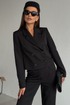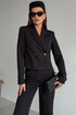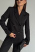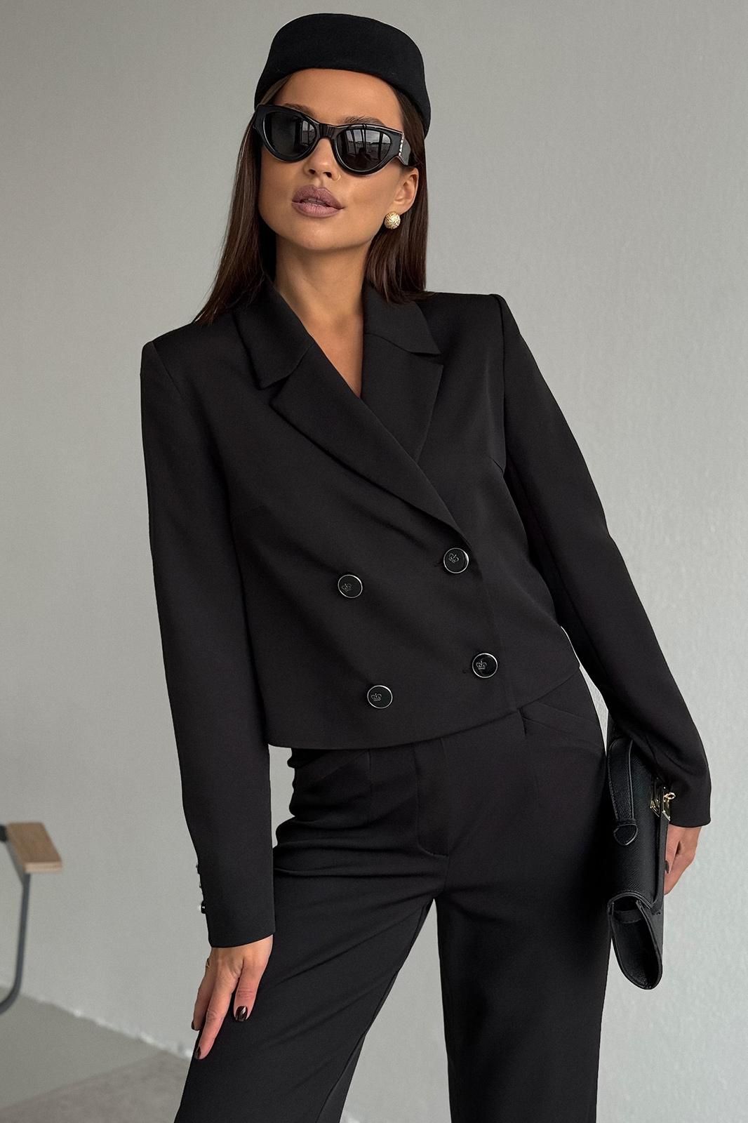 Жакет укороченный, полуприлегающего силуэта, с втачным рукавом. Спинка с таллиевыми вытачками. Перед с нагрудными вытачками из бокового шва, центральной двубортной застежкой на две пары петель пуговиц и воротником пиджачного типа. Рукава втачные, двух-шовные с обработанной шлицей обманкой на 4 петли- пуговицы. Жакет на подкладке.
