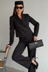 Брюки- палаццо, прямые расширенные к низу, на притачном поясе со шлевками и застежкой на одну пуговицу. Сзади брюки с таллиевыми вытачками. Перед брюк с одной фиксированной складкой, боковыми карманами и застежкой на тесьму молнию в среднем шве брюк.