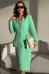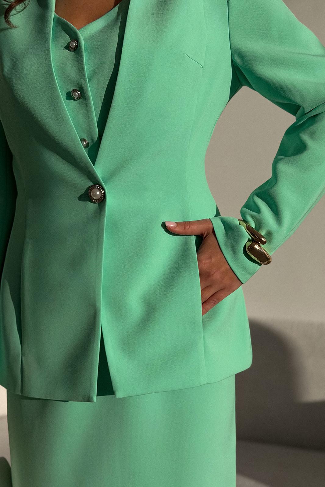 Жакет полуприлегающего силуэта, длинной чуть ниже линии бедер. Спинка с вертикальными рельефами. Перед с рельефами от проймы и отрезным бочком. С нагрудными вытачками от рельефов. В шве рельефа обработаны карманы в швах. Жакет с фигурным вырезом горловины, фигурным бортом, застегивающимся на одну пуговицу. Рукава втачные двух-шовные.