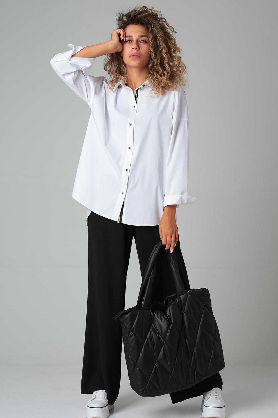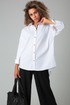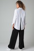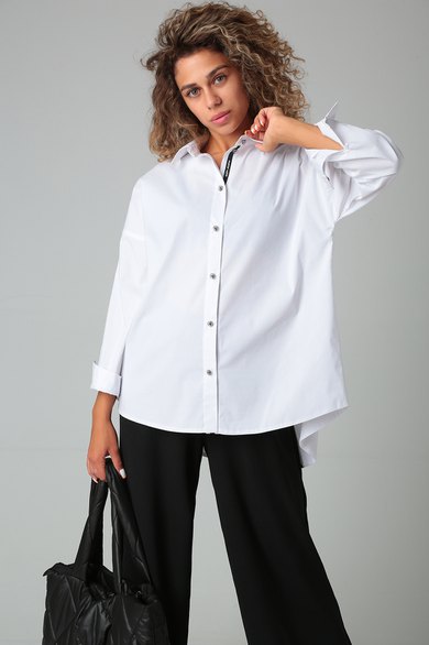 Блузка свободного силуэта, удлиненная, из рубашечной ткани. Перед на застежке петли-пуговицы. Воротник на стойке. Спинка разрезная с декоративными элементами. Рукав втачной на спущенной пройме, длинный с манжетой на застежку.