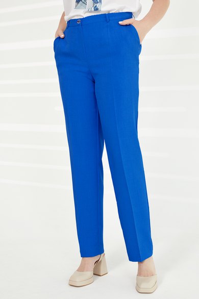 Классические брюки из льна-вишера. Брюки прямого силуэта, чуть зауженные к низу, на притачном поясе со шлевками и застежкой на петлю-пуговицу. Сзади вытачки. По всей длине заутюжены стрелки.