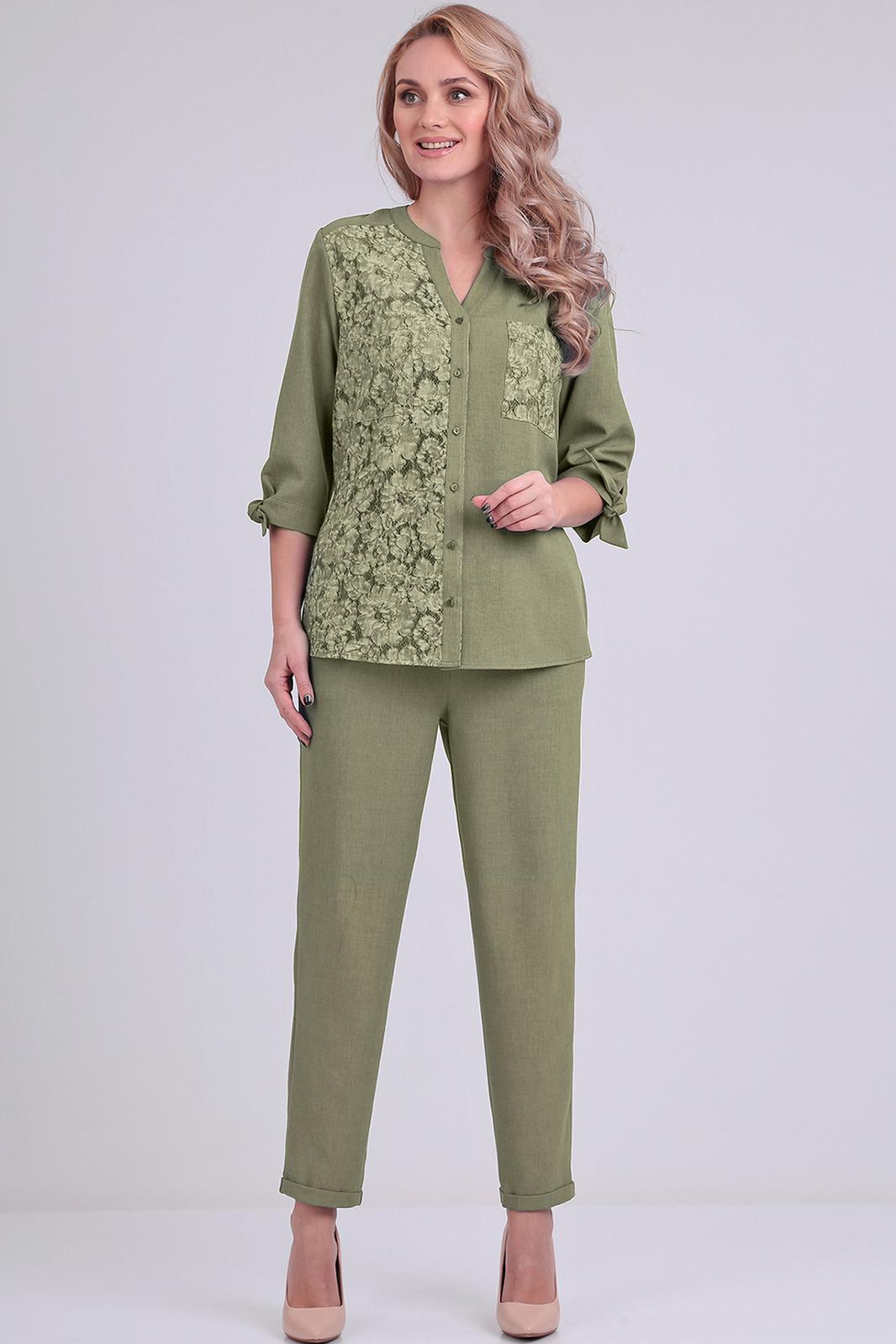 Костюм брючный. Блуза прямого силуэта с центральной застежкой-планкой на петли-пуговицы. Вырез горловины, обработан планкой фигурной формы. На полочке расположены накладные карманы. Рукав втачной, одношовный, с притачным манжетом с завязывающимися концами. По линии плеча вставлена цельнокройная кокетка, переходящая с полочки на спинку блузы. Длина блузы по передней полочке 68см, спинка длиннее на 4см, длина рукава 44см. Брюки на притачном поясе-резинке со вставкой кулисной тесьмы из основной ткани, которая втянута по кругу. Впереди на поясе концы тесьмы выходят через отверстия-петли. Передняя половинка брюк с косыми карманами, задняя половинка с имитацией кармана в рамку. По низу брючины - манжеты. Брюки со средней посадкой, легкой свободой в верхней части на уровне бедра и заужением к низу. Длина брюк 94см.
