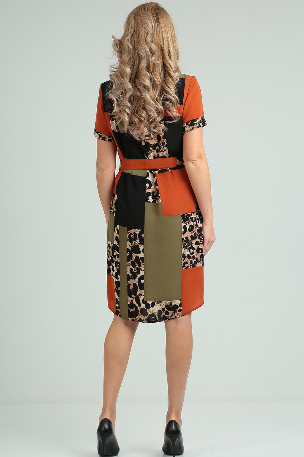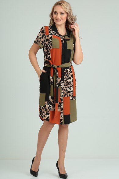 Платье прямого силуэта с центральной застежкой-планкой на петли-пуговицы. Полочки с кокетками и накладными карманами. От кокеток вниз идут вертикальные нагрудные вытачки. На спинке под кокеткой заложена встречная складка. Вырез горловины округлый с воротником на стойке рубашечного типа. Рукав втачной одношовный с цельнокроеной манжетой. В боковых швах платья карманы. Низ платья фигурный с разрезами в боковых швах. Пояс съемный. Длина платья 103см, длина рукава 20см.