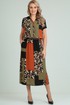 Платье прямого силуэта с талиевым подрезом, собранным эластичной тесьмой. Лиф полочки с горизонтальными нагрудными вытачками, центральной застежкой-планкой на петли-пуговицы и настрочными клапанами. Вырез горловины округлый с воротником на стойке рубашечного типа. На спинке под кокеткой заложена бантовая складка. Рукав втачной одношовный. На юбке платья под талиевым подрезом косые карманы. Низ платья с разрезами в боковых швах. Длина платья 133см, длина рукава 15см.
