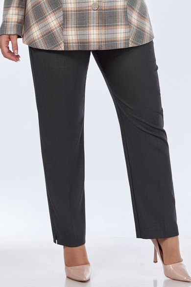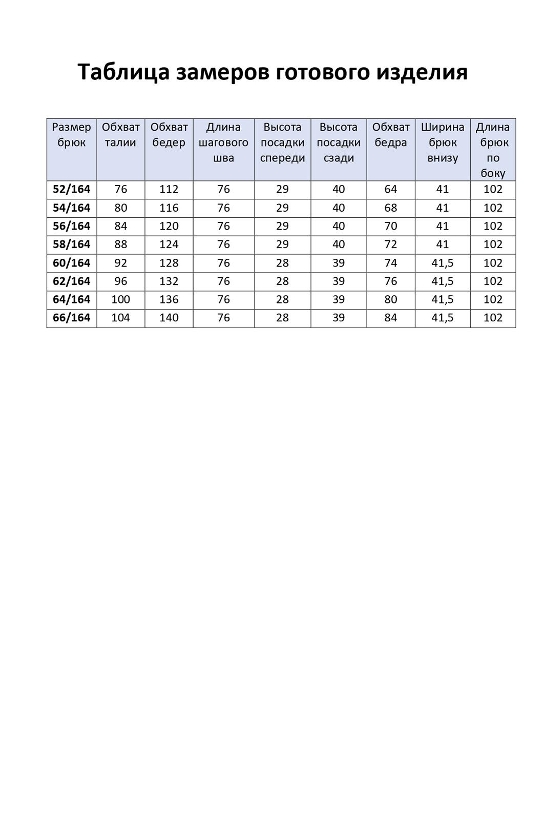 Брюки классические с заутюженными стрелками, слегка зауженные к низу, оформлены притачным поясом, частично на резинке. Застежка спереди брюк на молнию и петлю-пуговицу.
