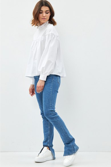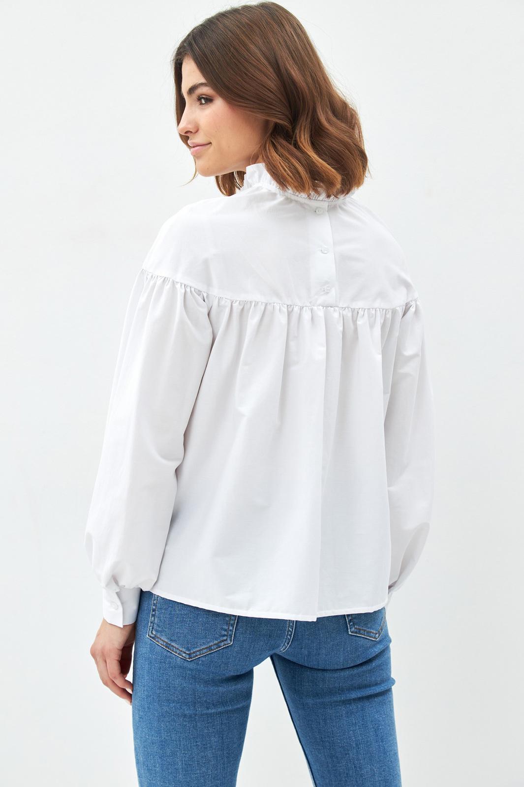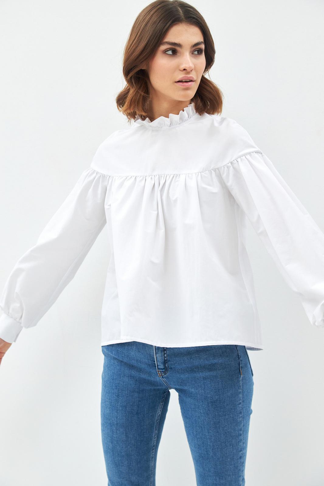 Свободная блузка с оборками. Воротник стойка с рюшей, длинный рукав, по спинке застежка на пуговицы.