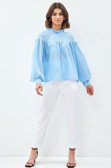 Свободная блузка с оборками. Воротник стойка с рюшей, длинный рукав, по спинке застежка на пуговицы.Прямые зауженные к низу брюки со стрелками. Карманы с наклонным входом, пояс сзади на резинке.