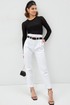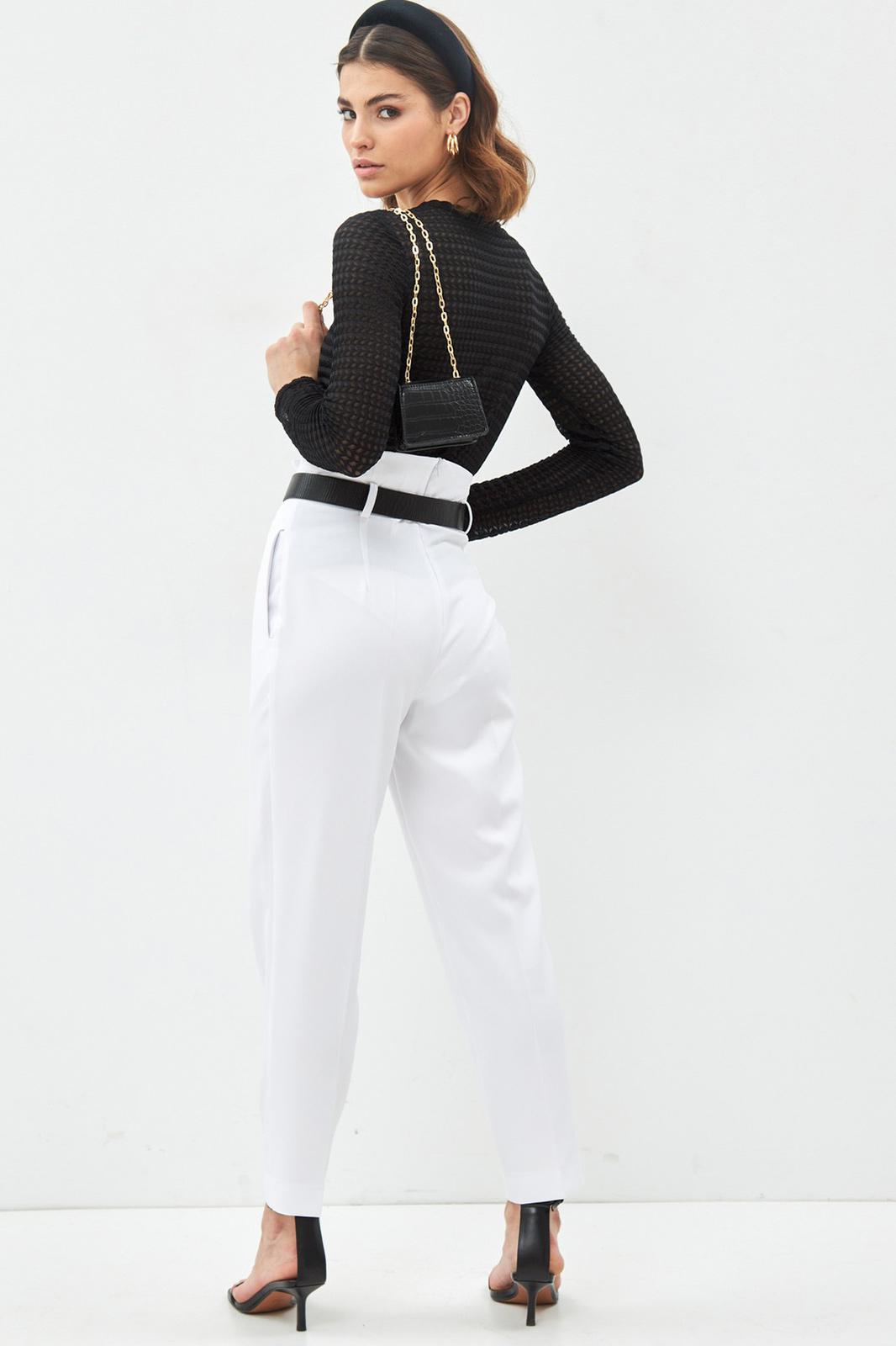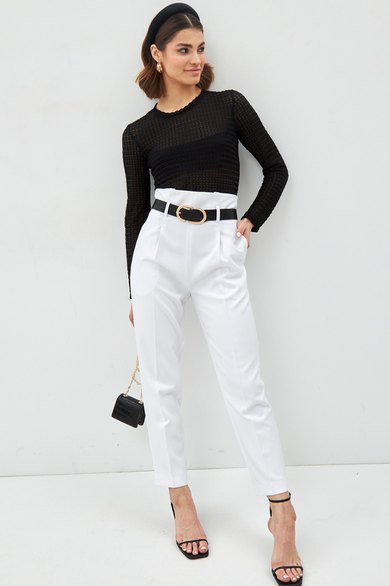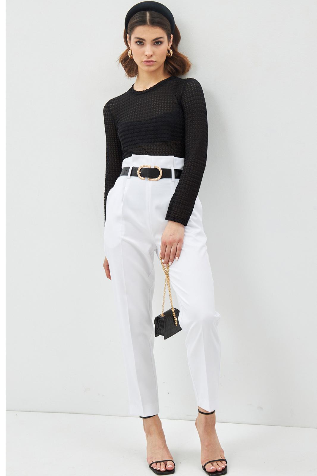 Трикотажный джемпер из фактурной ткани. Круглый вырез горловины, длинный рукав. Прямые зауженные к низу брюки с завышенной талией. На поясе складке, карманы с наклонным входом.