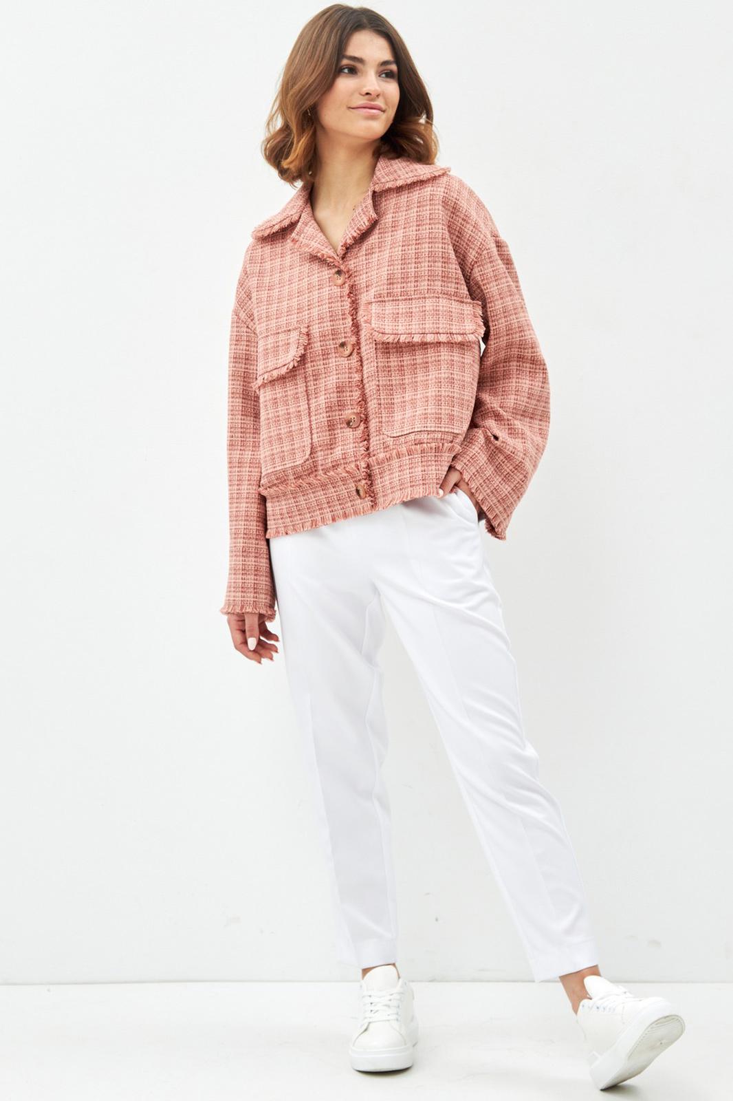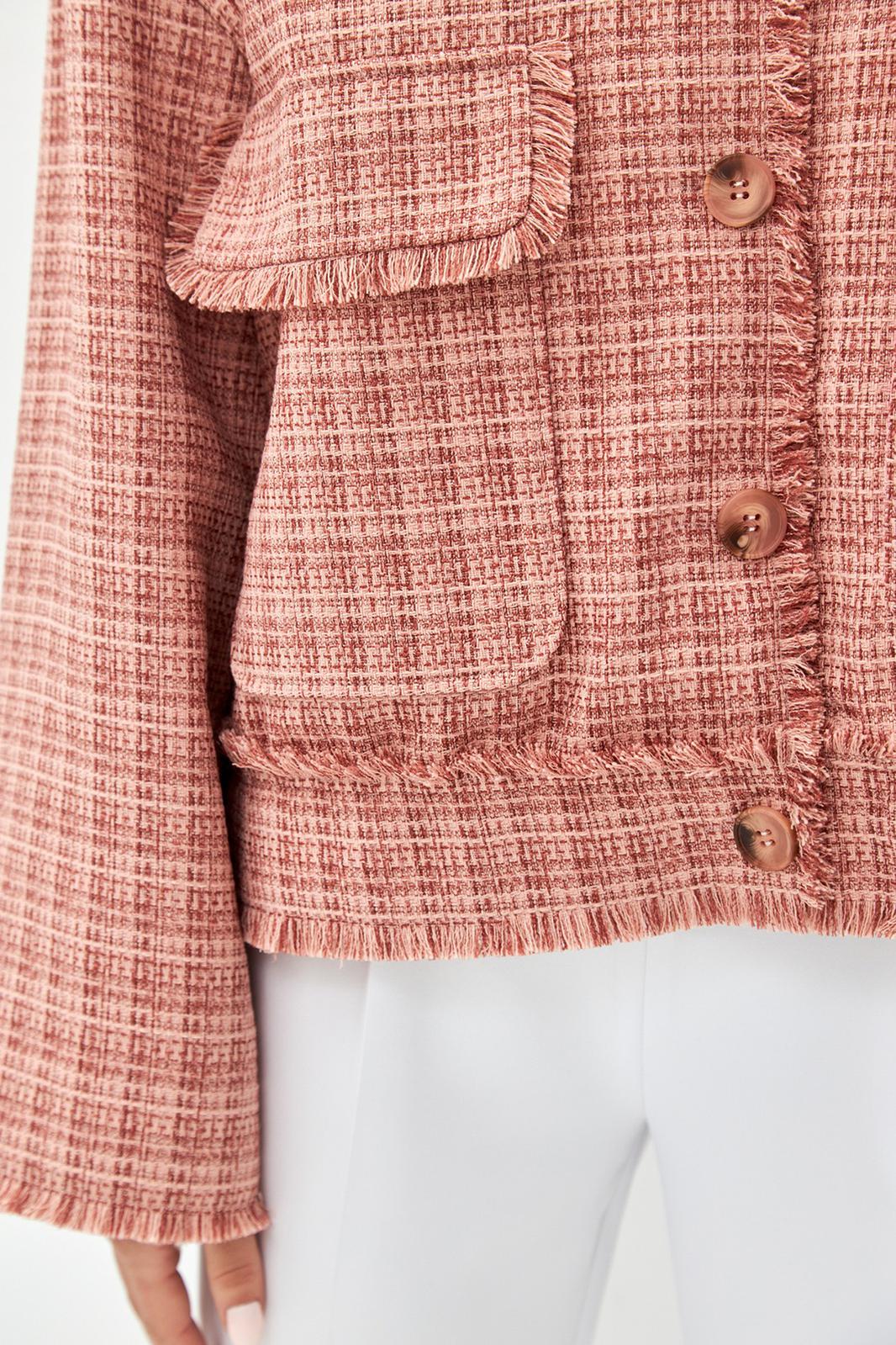 Жакет из твида. Длинный спущенный рукав, накладные карманы, застежка на пуговицы. Декорирован бахрамой.