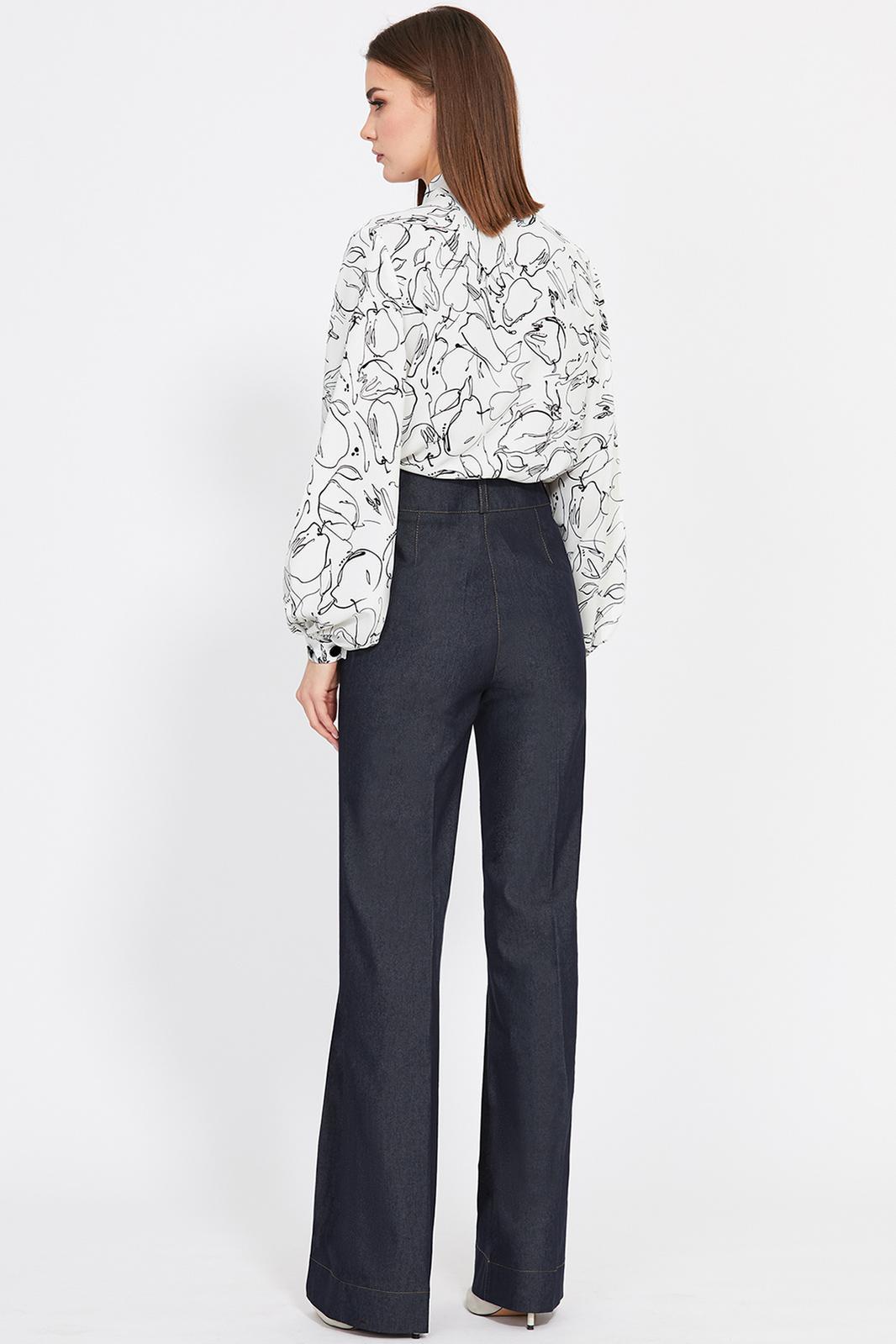 Брюки выполнены из джинса. Брюки с легким расширением от колена, на притачном поясе, длиной в пол. Застежка спереди на молнию с гульфиком и две пуговицы. Спереди накладные карманы. Низ брюк обработан широкой подгибкой с закрытым срезом. Передние и задние части брюк заутюжены на кант.