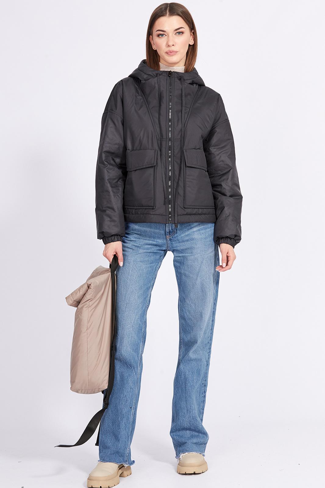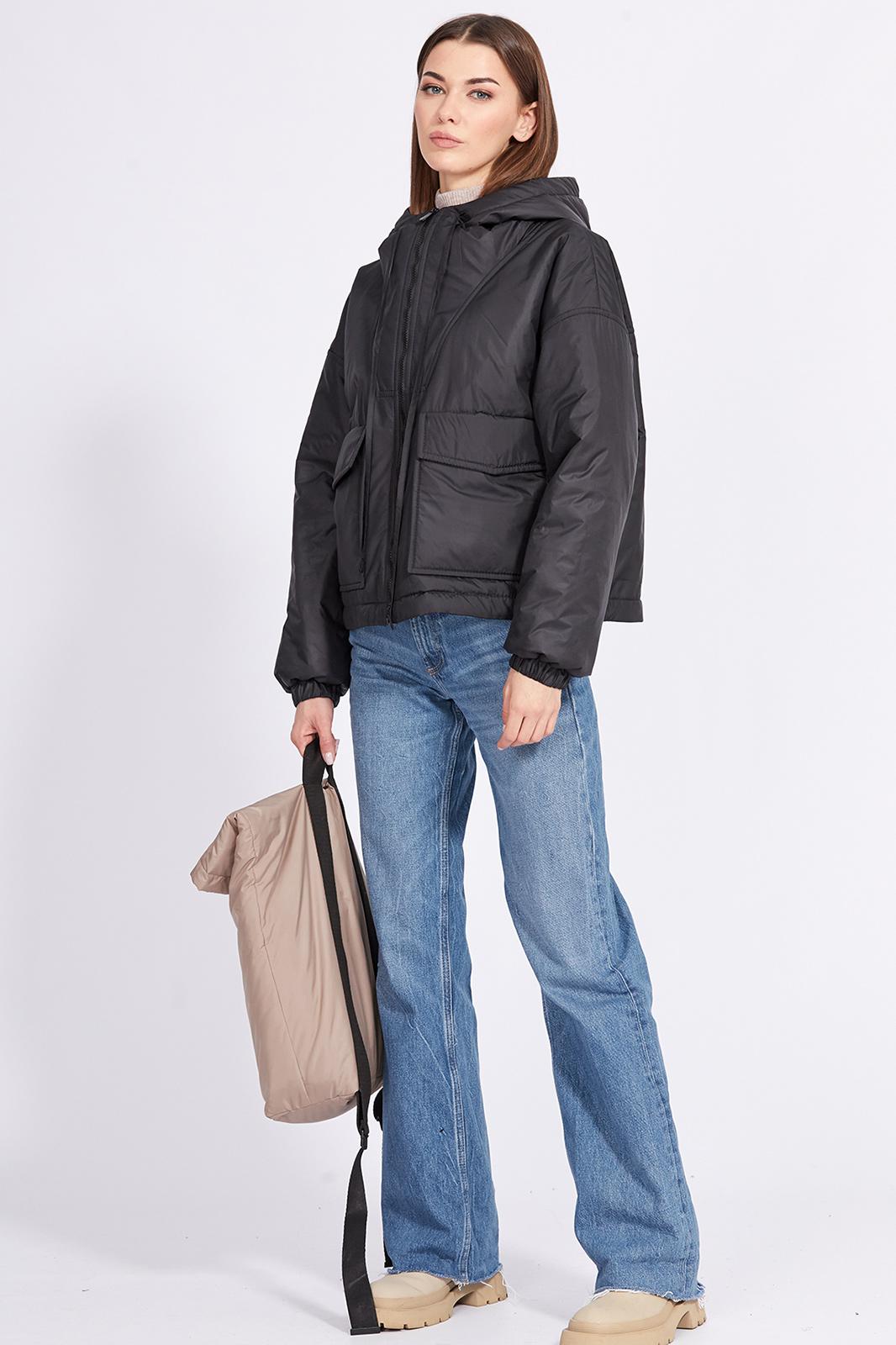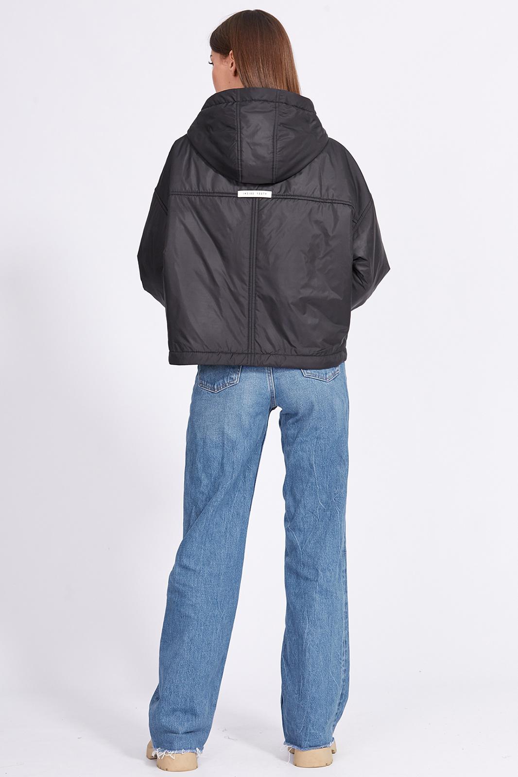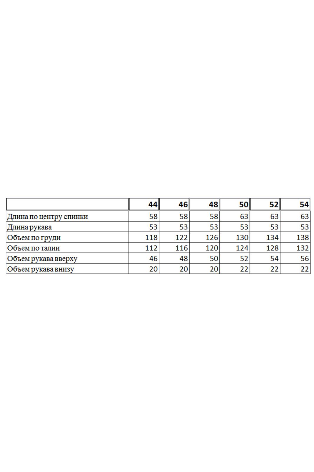 Куртка выполнена из плащевой ткани, простеганной с изософтом L60. Куртка прямого силуэта, длиной выше линии бедер. Спереди кокетка, переходящая в капюшон, накладные карманы с клапанами, застежка на молнию. На спинке кокетка и средний шов. Плечевой шов спущен. Рукав одношовный. Низ рукава на манжете с эластичной тесьмой. По низу куртки эластичная тесьма с фиксаторами. По спинке куртка декорирована нашивкой. Длина куртки по спинке: р.44-48 - 58 см, р.50-54 - 63 см. Длина рукава - 53 см.