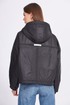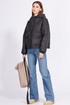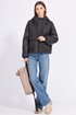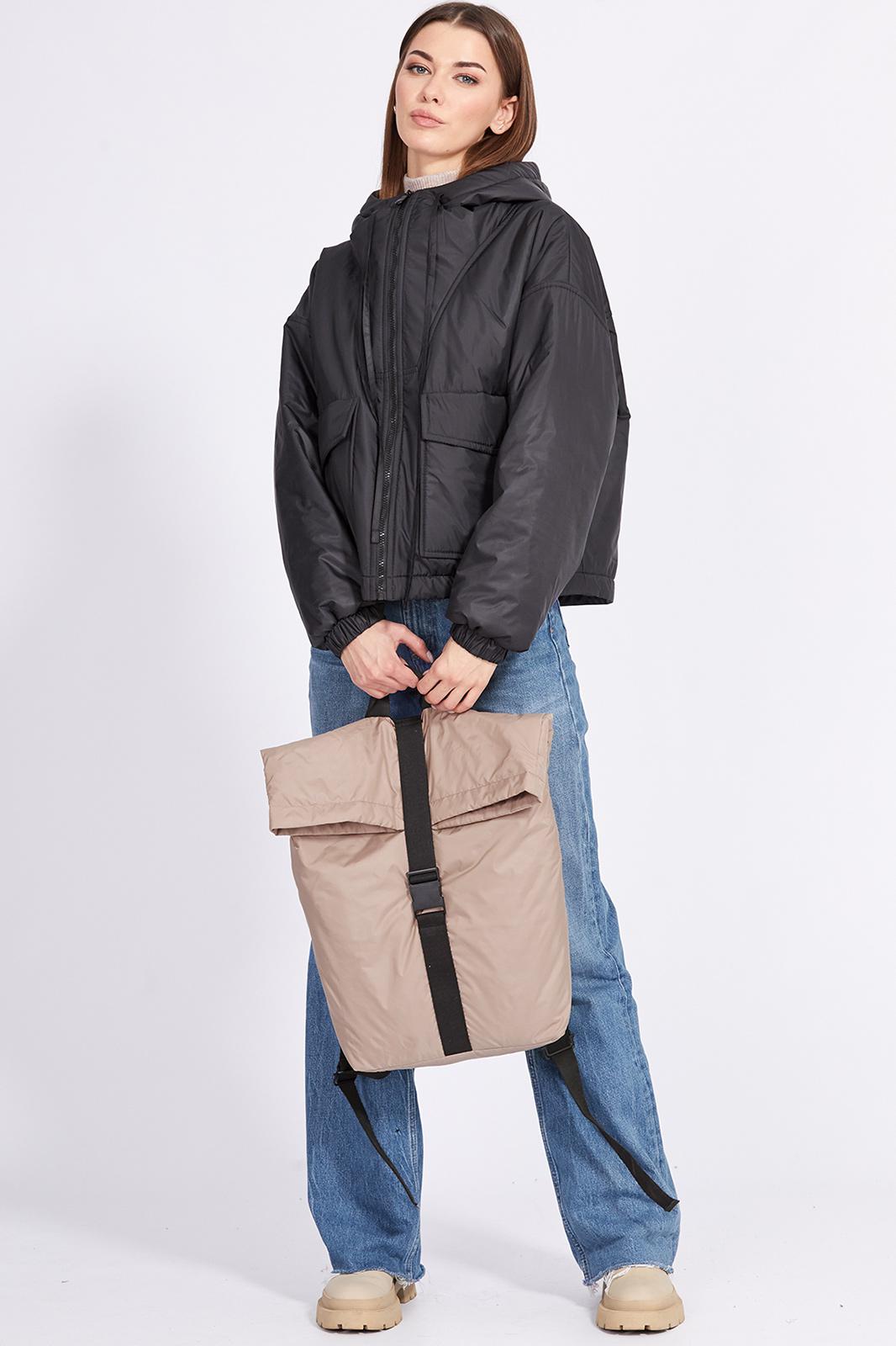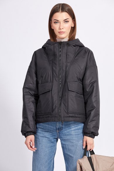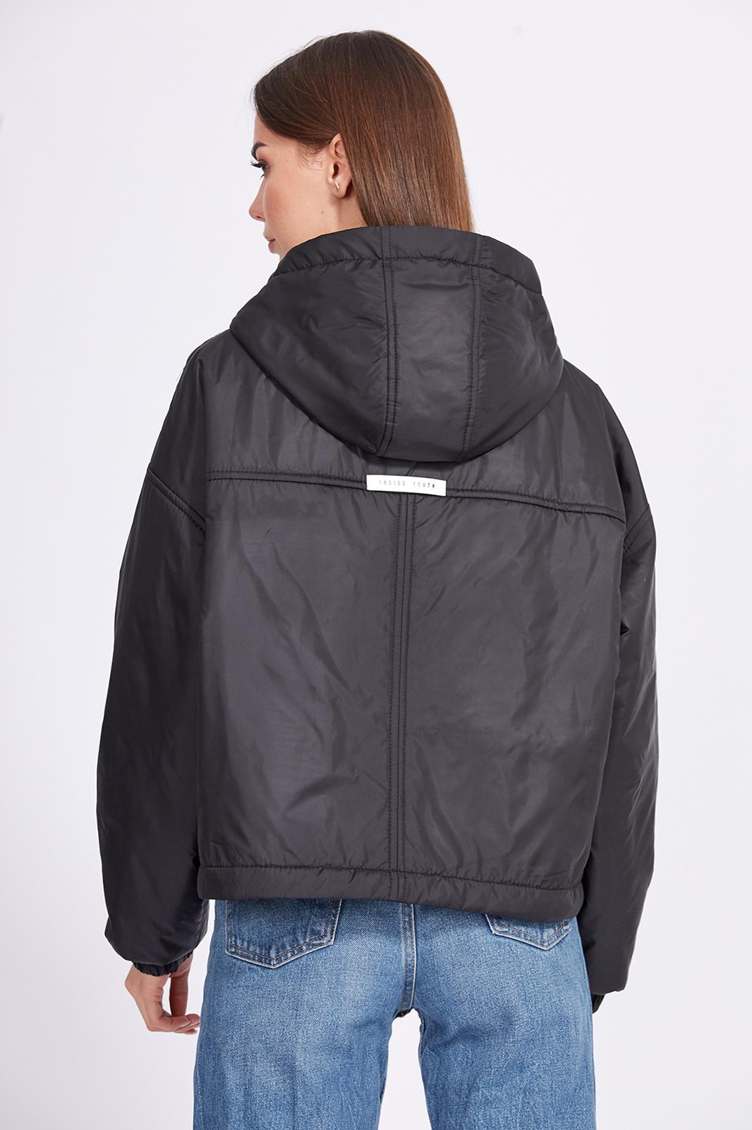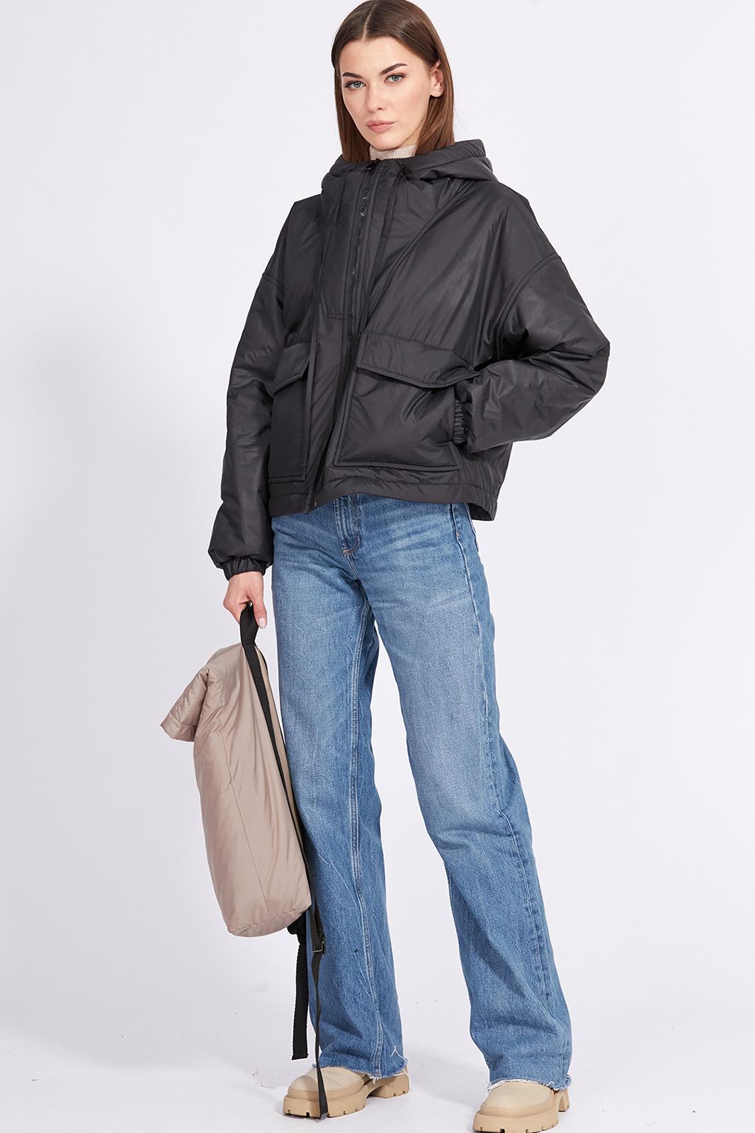 Куртка выполнена из плащевой ткани, простеганной с изософтом L60. Куртка прямого силуэта, длиной выше линии бедер. Спереди кокетка, переходящая в капюшон, накладные карманы с клапанами, застежка на молнию. На спинке кокетка и средний шов. Плечевой шов спущен. Рукав одношовный. Низ рукава на манжете с эластичной тесьмой. По низу куртки эластичная тесьма с фиксаторами. По спинке куртка декорирована нашивкой. Длина куртки по спинке: р.44-48 - 58 см, р.50-54 - 63 см. Длина рукава - 53 см.