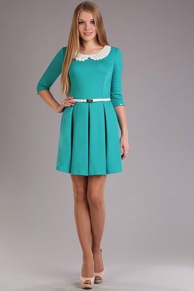 Нарядное трикотажное платье с воротником, расшитым перламутровыми бусинками. Платье застегивается на потайную молнию на спине, в боковых швах карманы. В комплекте прилагается пояс. Длина платья - 85 см.