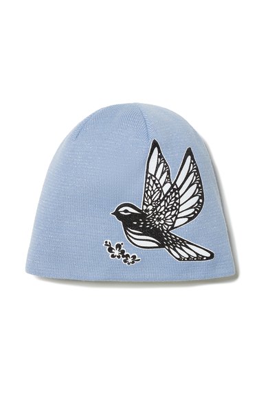 Шапка детская с сияющими нитями люрекса и рисунком Птица, выполненным с помощью термопечати . Связана переплетением двуластик.