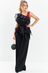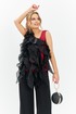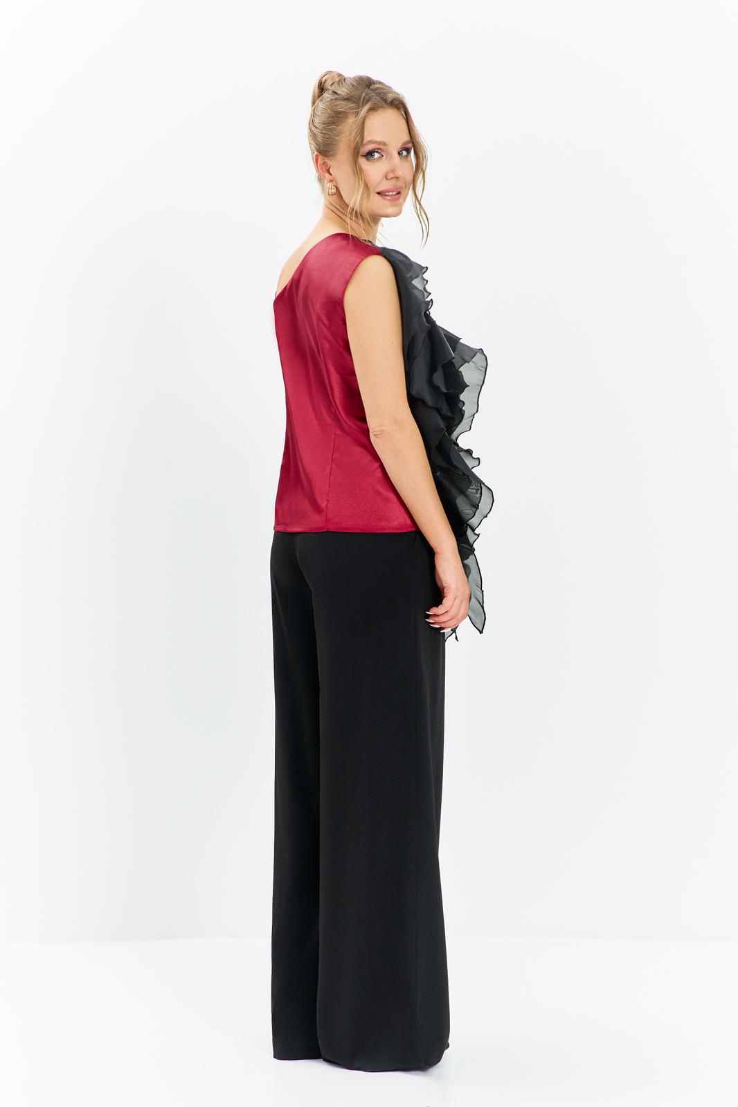 Блуза с настрочными воланами из органзы по полочке, горловина асимметричная, изделие без рукавов, на спинке блузы таллиевые выточки.