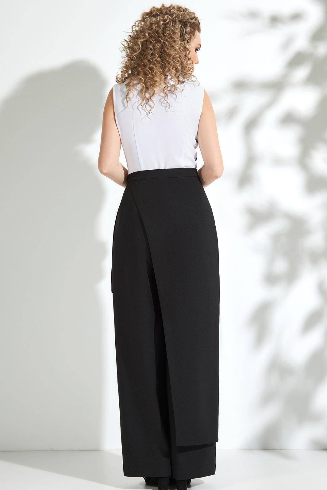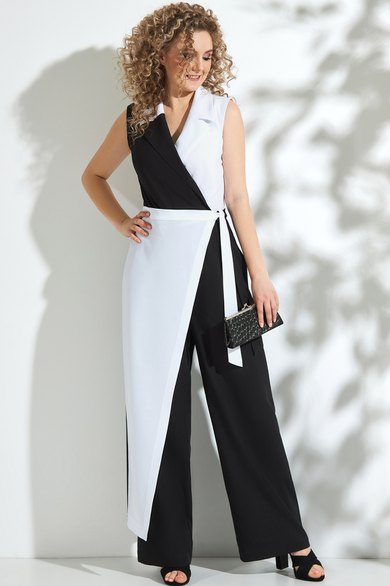 Комбинезон отрезной по линии талии, полочка изделия «на запах». Воротник отложной с лацканами. Брючина прямого кроя. В комплект входит пояс и съемная юбка.