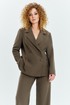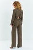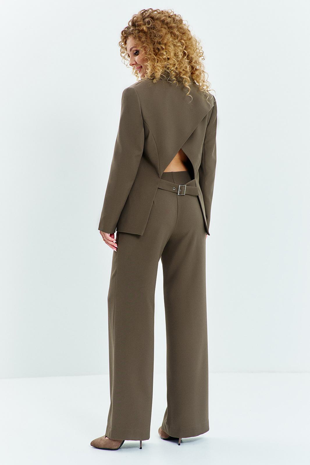 Костюм женский двухпредметный состоит из жакета и брюк. Жакет двубортный с отложным воротником и лацканами (английский воротник). По полочке жакета расположены рельефа с нагрудной выточкой и карманы. Рукав втачной длинный. Спинка жакета распашная, с фиксацией по плечам, в области талии на спинке декоративная перетяжка. Брюки прямого кроя с небольшим расклешением, брюки без пояса с обтачкой, застежка брюк молния.