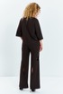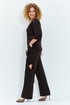 Костюм женский двухпредметный состоит из блузона и брюк. Блузон женский ассиметричного кроя, свободного прилегания. Блузон ассиметричного кроя, горловина округлая, по полочке расположена ассиметричная планка и декоративный хлястик с пряжкой. Рукав спущенный широкий укороченный с широкой манжетой по низу. Брюки асимметричного кроя, завышенной посадки, на притачном поясе с резинкой по переду брюк расположены функциональные карманы. Брюки разрезные по передней и задним частям брюк расположены декоративные прорези (обработанные).