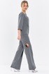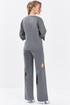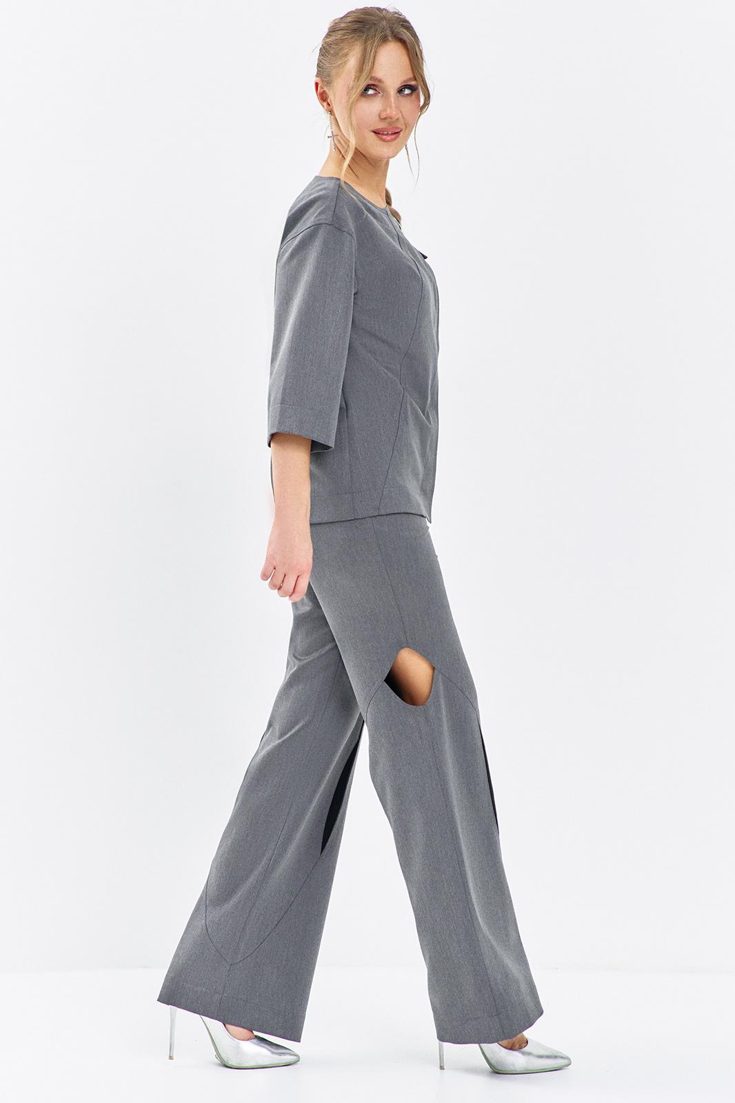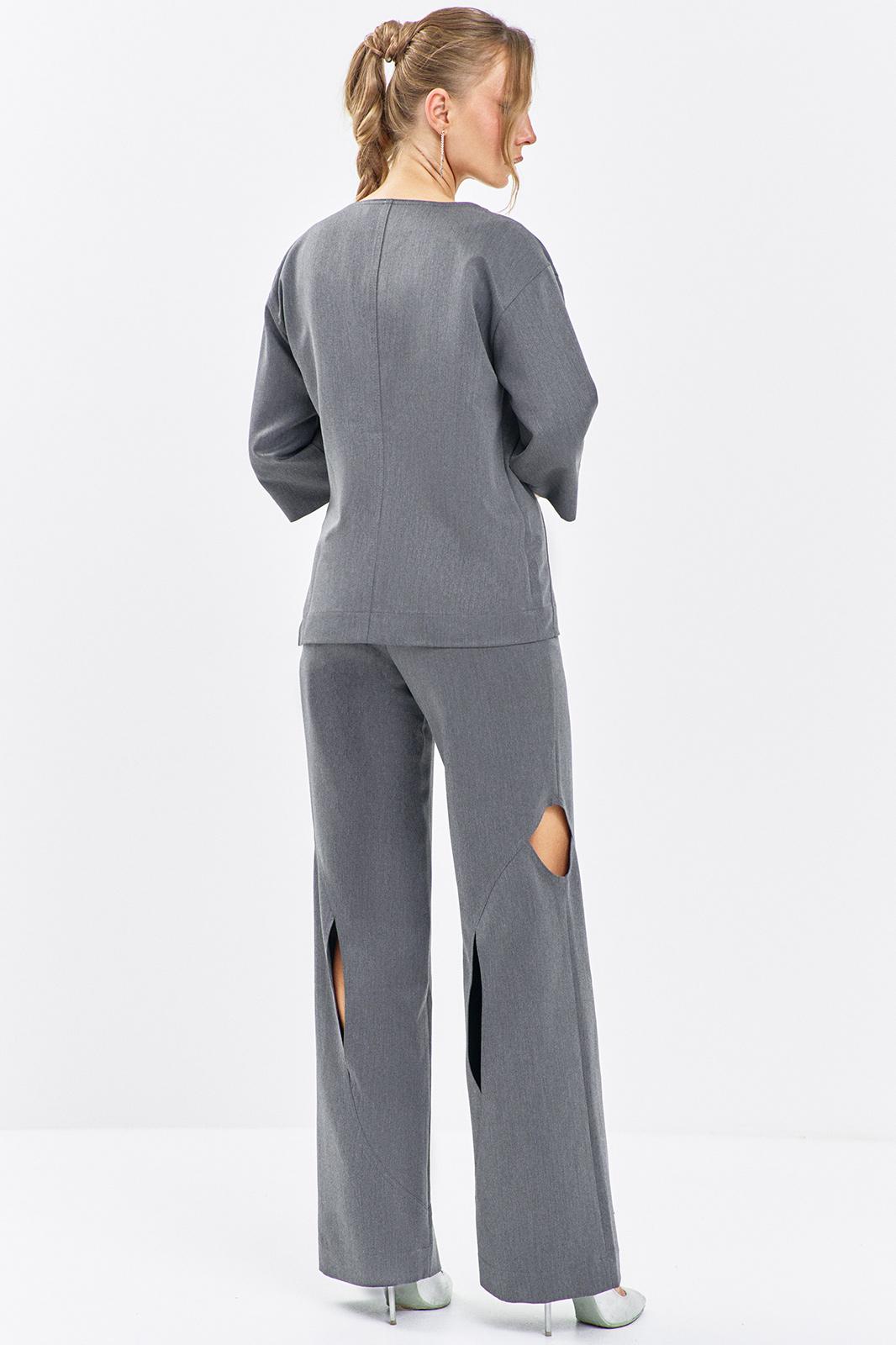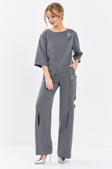 Костюм женский двухпредметный состоит из блузона и брюк. Блузон женский ассиметричного кроя, свободного прилегания. Блузон ассиметричного кроя, горловина округлая, по полочке расположена ассиметричная планка и декоративный хлястик с пряжкой. Рукав спущенный широкий укороченный с широкой манжетой по низу. Брюки асимметричного кроя, завышенной посадки, на притачном поясе с резинкой по переду брюк расположены функциональные карманы. Брюки разрезные по передней и задним частям брюк расположены декоративные прорези (обработанные).