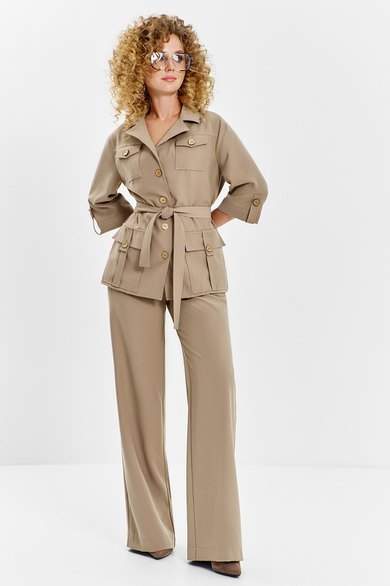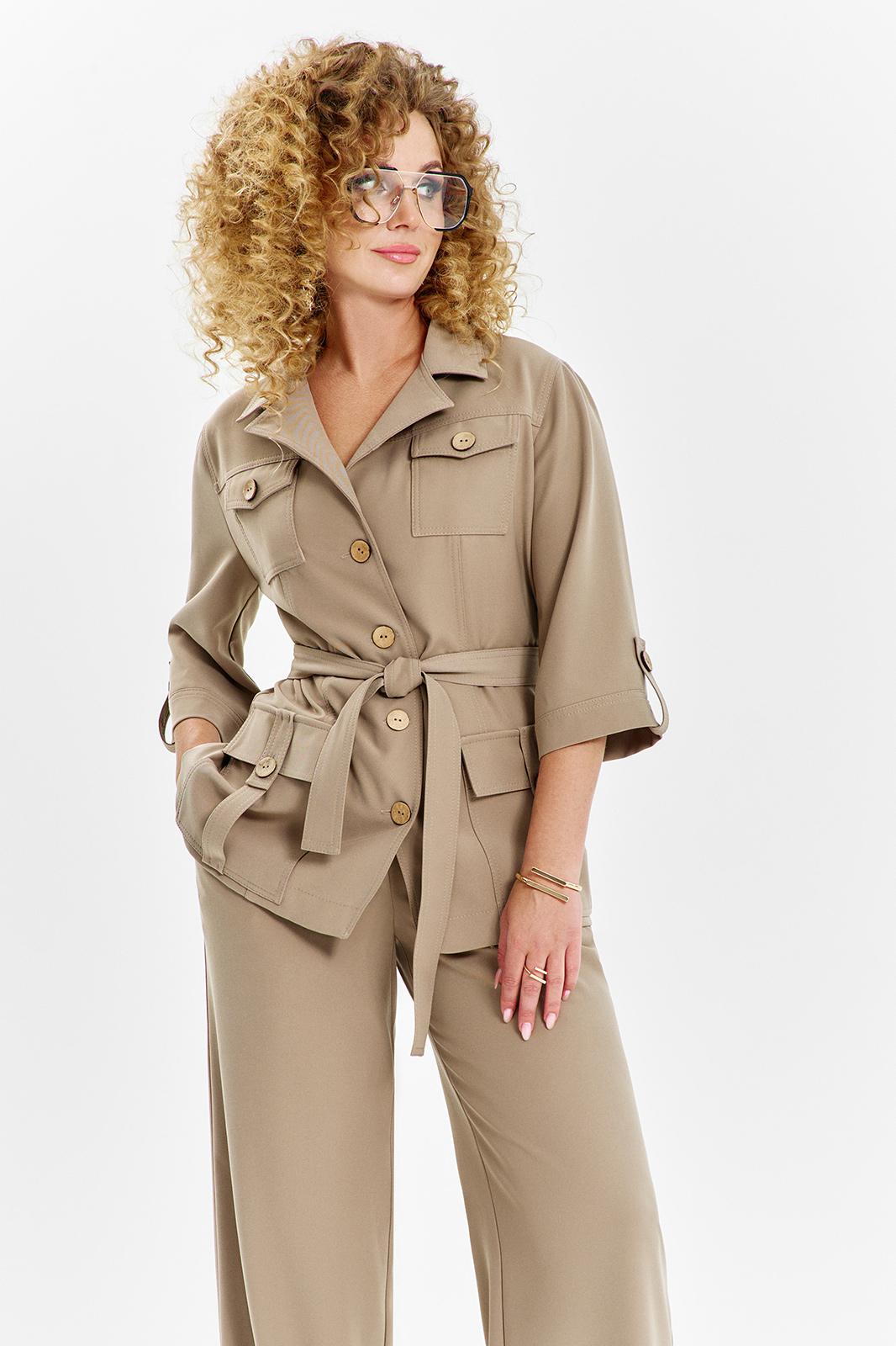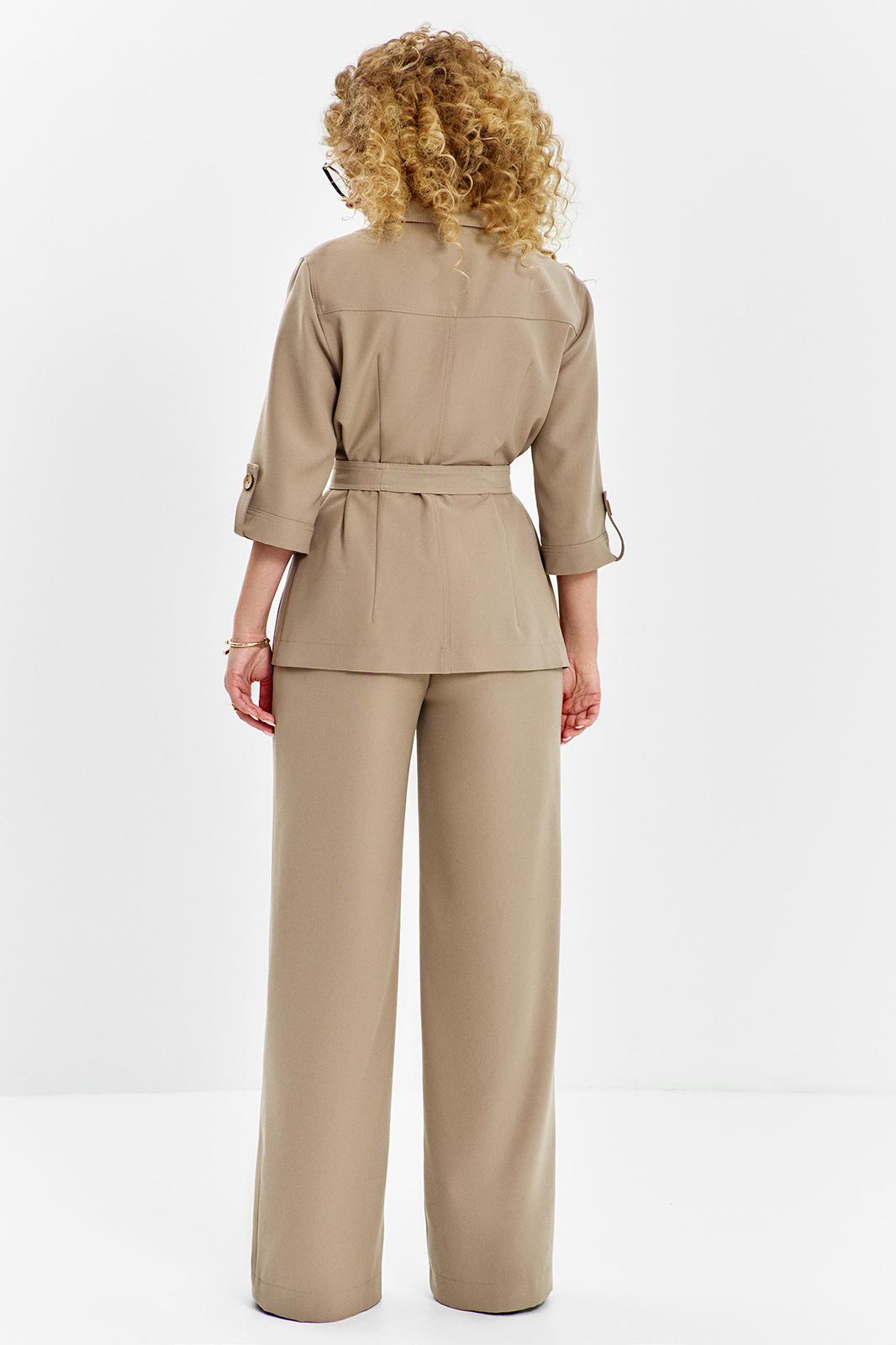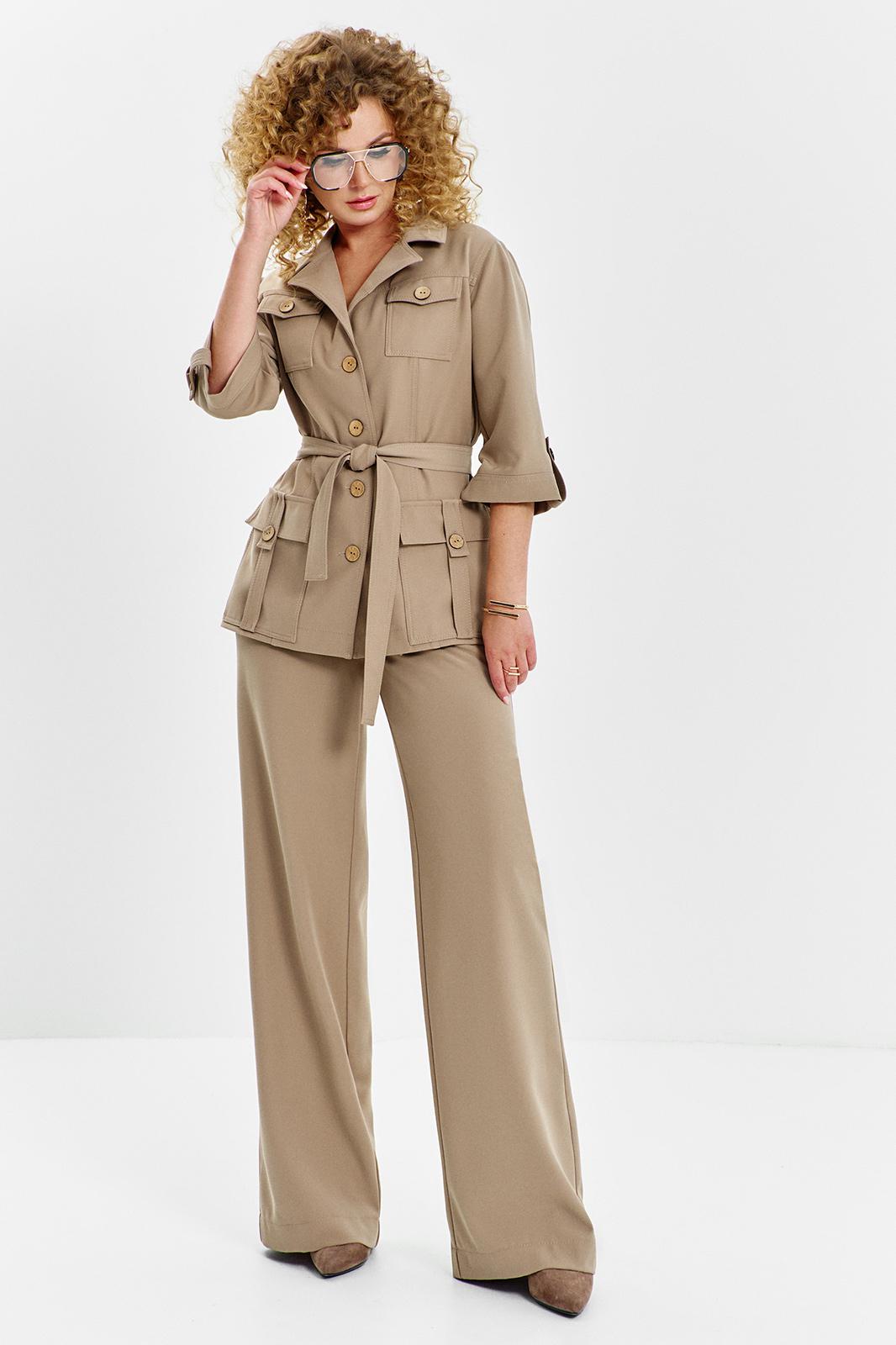 Костюм женский двухпредметный, состоящий из жакета и брюк. Костюм выполнен в стиле «Сафари». Жакет полуприлегающего силуэта, с втачным рукавом, рукав декорирован патой. Горловина жакета обработана отлетным воротником с лацканами. По переду изделия расположены накладные карманы с клапанами в линии груди и на талии. Спинка изделия разрезная с кокеткой. На спинке имеются талиевые вытачки. Брюки комплекта, классического кроя на притачном поясе с резинкой. Брюки средней посадки. По боковым швам брюк расположены функциональные карманы. Застежка-молния на гульфике и петля-пуговица на поясе. В комплект входит пояс в цвет комплекта (из основной ткани).