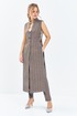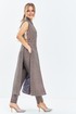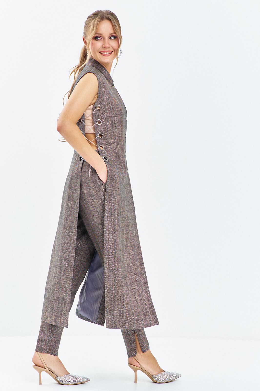 Костюм женский состоит из жилета и брюк, жилет удлинённый с V-образным вырезом и воротником стойкой. Жилет без бочков, с декоративными металлическими люверсами и цепочкой. Брюки зауженные на притачном поясе-кокетке, в боковых швах имеются карманы с бочком. застежка- молния на гульфике, по низу брюк в разрезы вставлены потайные молнии.