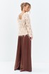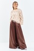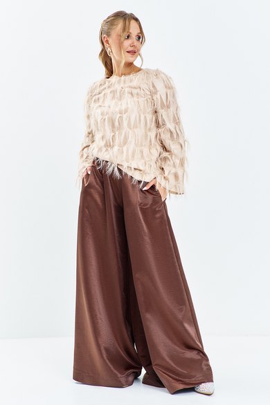 Комплект брючный состоит из джемпера и брюк. Брюки средней посадки расширенные к низу ( клеш от бедра , Юбка- брюки )выполнены из атласной ткани с приглушенным блеском. Брюки на притачном поясе с резинкой и застежкой молнией. Блузон выполнен из ткани с бахромой, горловина округлая - - лодочка, рукав втачной длинный, на спинке глубокий округлый вырез и декоративная жемчужная нить.