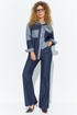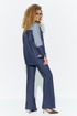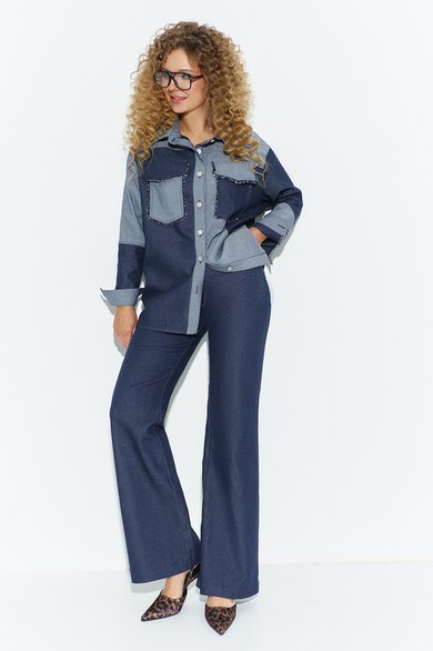 Костюм женский двойка из джинса, состоит из джинсовой рубашки и брюк( джинсы). Рубашка свободного кроя, на полочке расположена кокетка и накладные карманы с клапанами декорированные бахромой, воротник отложной на стойке, рукав втачной длинный низ рукава с манжетой, спинка с отрезной кокеткой. застежка- петля-пуговица на планках по переду. Брюки - клеш слегка расширенные к низу на притачном поясе, в боковых швах расположены карманы, на задних полотнищах брюк накладные фигурные карманы и кокетка. Застёжка молния на гульфике и петля-пуговица.