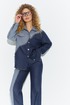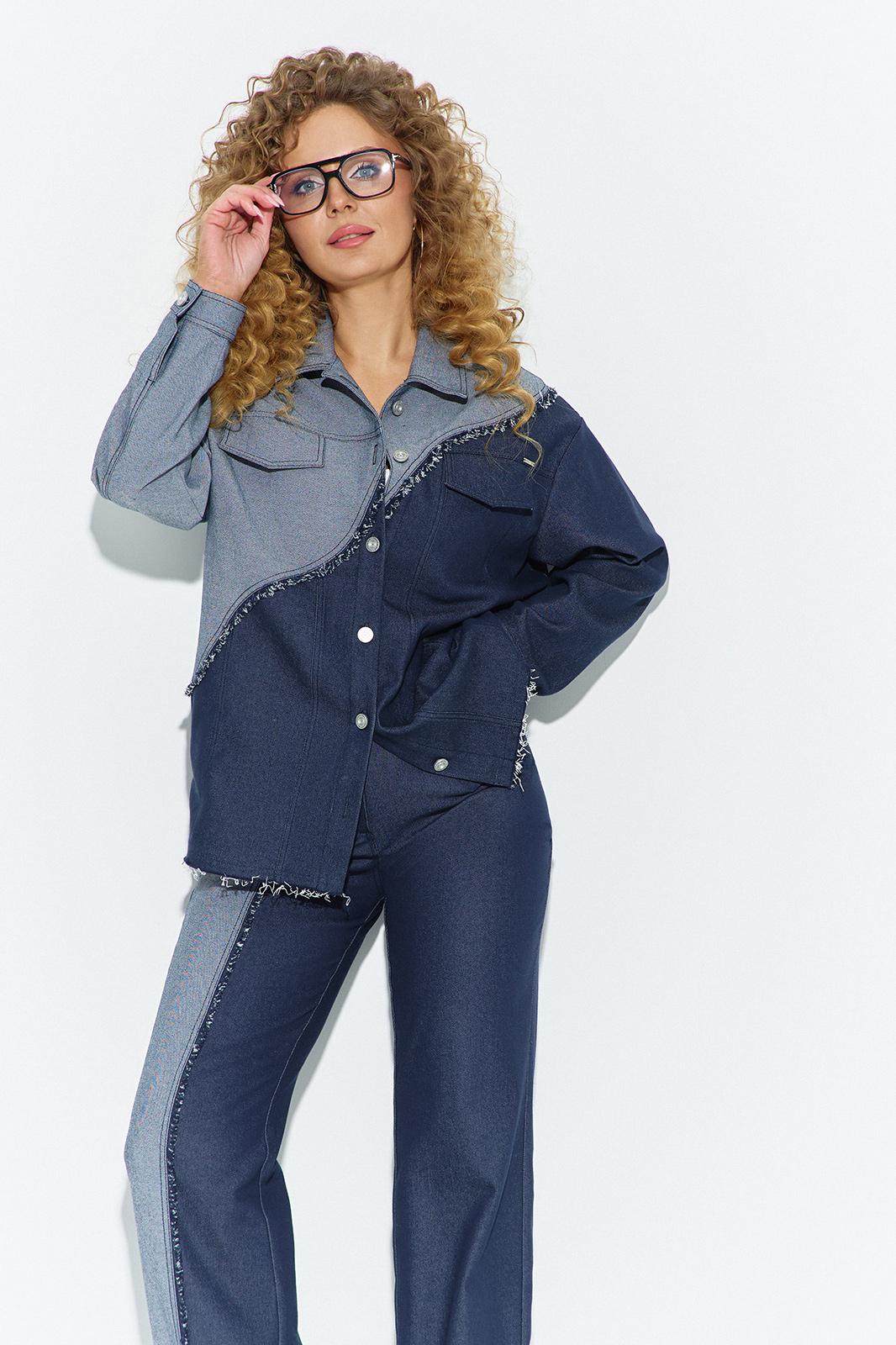 Костюм женский выполнен из денима (джинсы) состоит из джинсовой рубашки и брюк. Рубашка асимметричного кроя с декоративным подрезом и кокеткой, на полочках расположены потайные карманы с клапаном и рельефы.горловина- плосколежащий отложной воротник. Рукав вточной приспущенный, низ рукава обработан манжетой с застежкой петля- пуговица. Спинка изделия разрезная с рельефами и с декоративным асимметричным подрезом и бахромой. Низ рубашки обработан в открытый срез. застежка- петля- пуговица на планке. Брюки прямого кроя, завышенной посадки на притачном поясе. По переду Джинс -ассиметричная декоративная вставка с отделкой из бахромы, в боковых швах расположены карманы, на задней части брюк расположены накладные карманы. Низ брюк с широкой подгибкой обработан в открытый край.