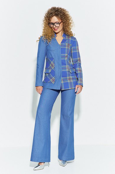 Костюм женский 2х-предметный, состоит из жакета и брюк. Жакет полуприлегающего силуэта выполнен из сочетания тканей Джинса и костюмной ткани, по полочке жакета расположена накладная деталь с функциональным прорезным карманом рамка, и декоративные фальш-карманы в области груди. Рукав втачной длинный. Горловина обработана плоско лежащим воротником-стойкой. Застежка жакета - потайная (супатная) на петли-пуговицы. Жакет на полной подкладке. Брюки классического кроя, с небольшим клешем к низу, с высокой посадкой, выполнены из джинсовой ткани. Пояс в брюках втачной в боковых швах имеются карманы, застежка молния на гульфике и петля-пуговица. На задних полотнищах брюк расположена накладные карманы.