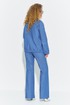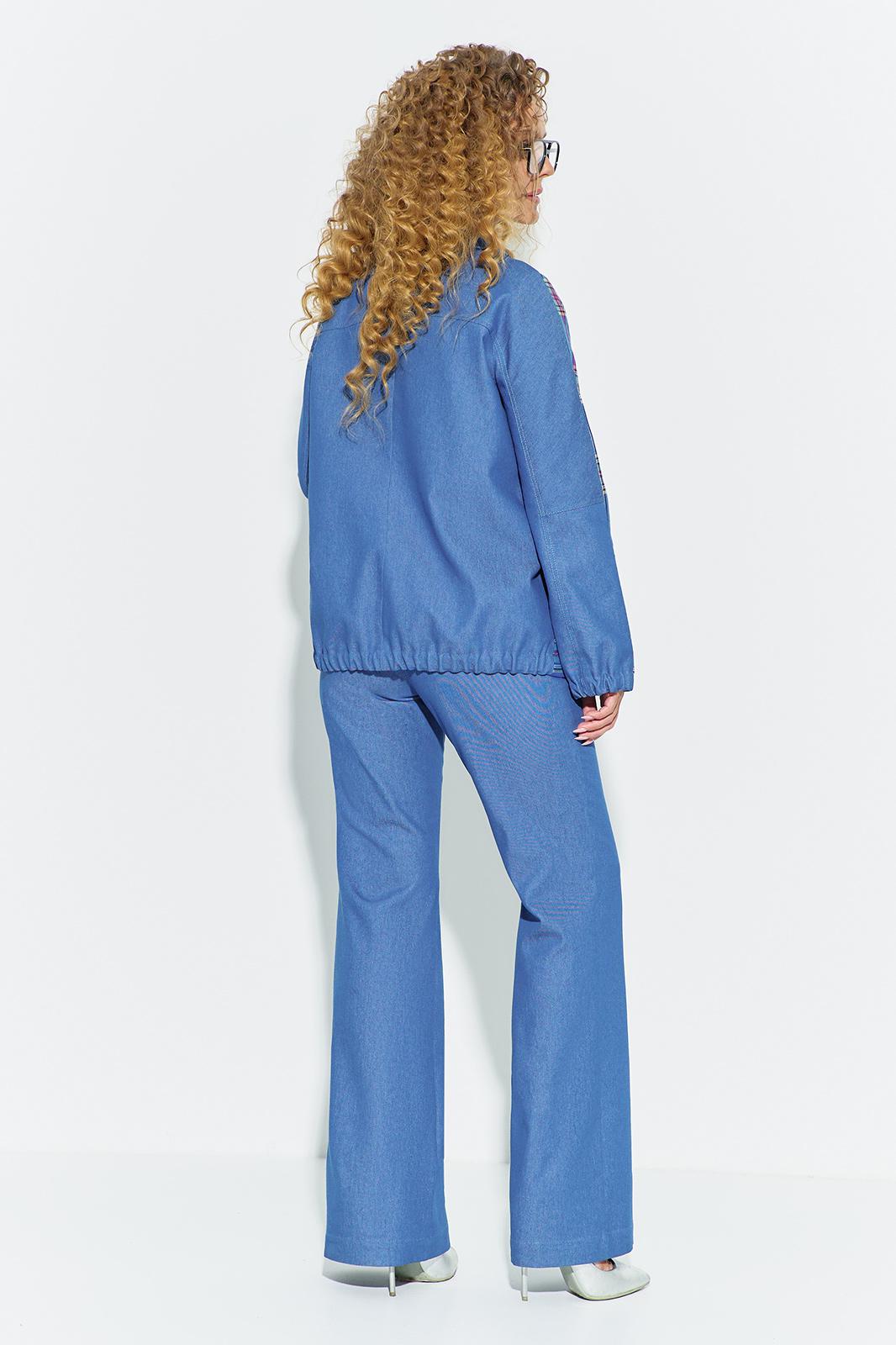 Костюм женский, состоит из жакета и брюк, выполнен в сочетании костюмной и джинсовых тканей. Жакет свободного кроя, не приталенный. Полочка жакета выполнена в стиле классического жакета с прорезными карманами - рамками и английским воротником (отложной воротник с лацканами). Спинка жакета с отрезной кокеткой выделенной ярким кантом, по низу жакета частичная эластичная тесьма. Рукав втачной длинный, по задней (джинсовой) части рукава расположена резинка. Брюки классического кроя, с небольшим клешем к низу, с высокой посадкой, выполнены из джинсовой ткани. Пояс в брюках втачной в боковых швах имеются карманы, застежка молния на гульфике и петля-пуговица. На задних полотнищах брюк расположена накладные карманы.