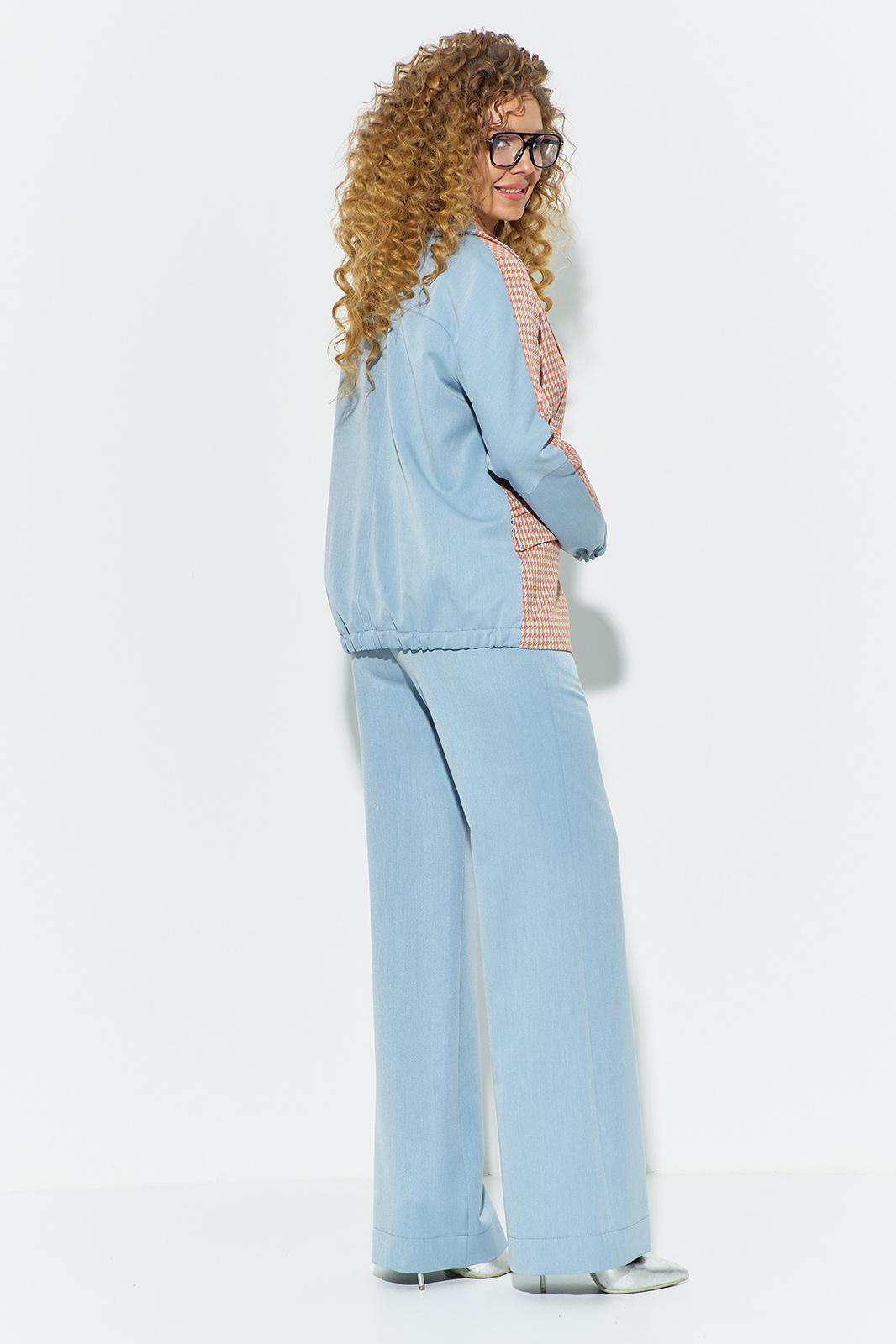 Костюм женский, состоит из жакета и брюк, выполнен в сочетании костюмных тканей. Жакет свободного кроя, не приталенный. Полочка жакета выполнена в стиле классического жакета с прорезными карманами - рамками и английским воротником (отложной воротник с лацканами). Спинка жакета с отрезной кокеткой выделенной ярким кантом, по низу жакета частичная эластичная тесьма. Рукав втачной длинный, по задней (джинсовой) части рукава расположена резинка. Брюки классического кроя, прямые от бедра, с высокой посадкой, в боковых швах расположены функциональные карманы. Пояс в брюках втачной с резинкой, застежка молния на гульфике и петля-пуговица