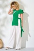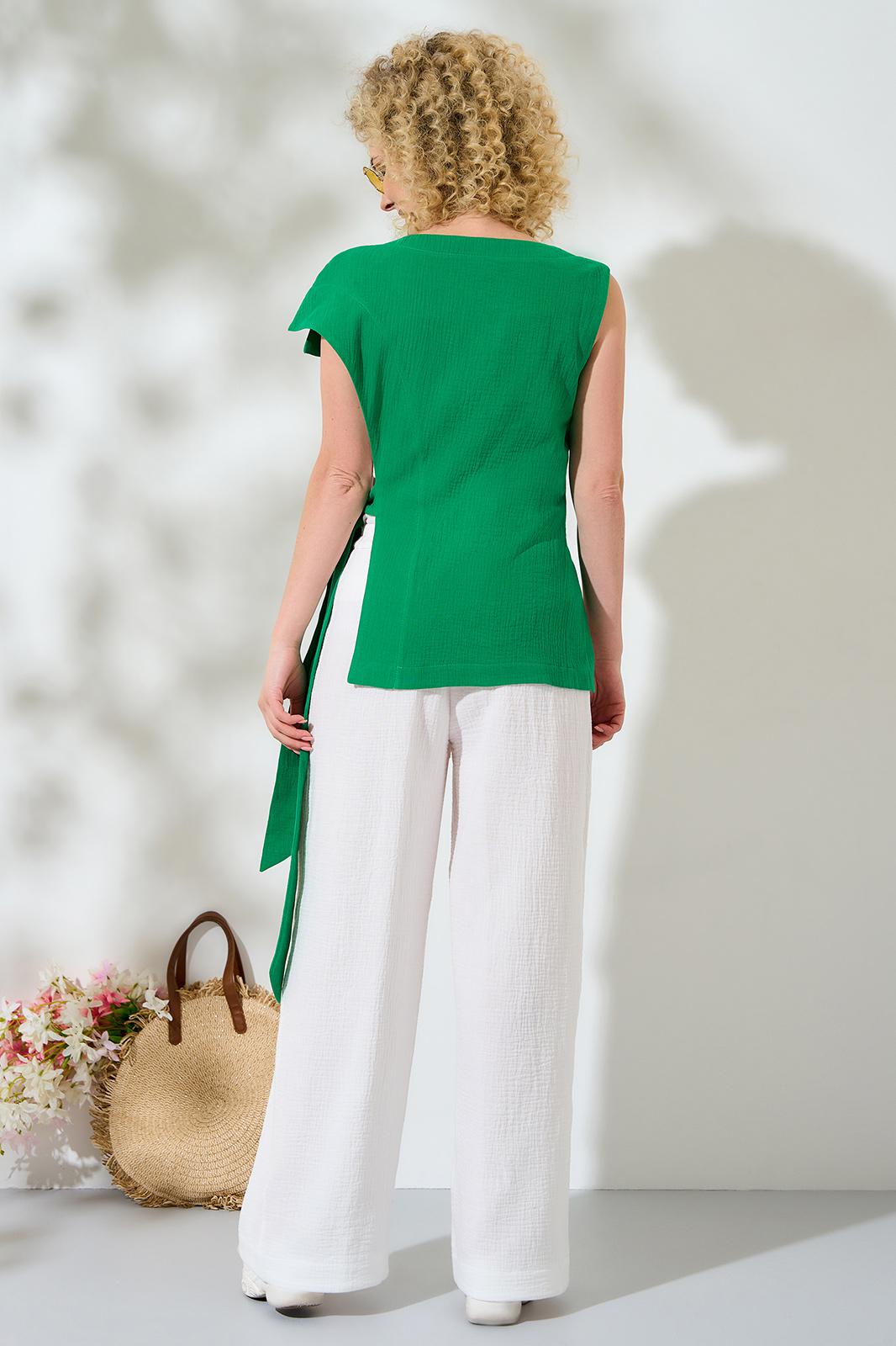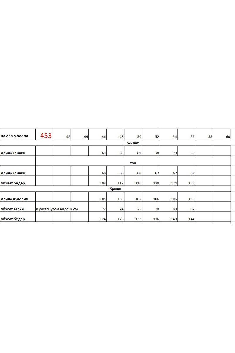 Костюм 3ка выполнен из мягкого хлопка- муслин костюм состоит из топа, брюк и асимметричного жилета. Топ комплекта на тонких шлейках, по полочке топа расположены вытачки. Брюки -палаццо, на притачном поясе с резинкой по переду брюк заложены складки, застежка молния на гульфике. Жилет асимметричный в боковом шве выполнен декоративный вырез. Горловина- лодочка. На линии груди расположен термопринт.