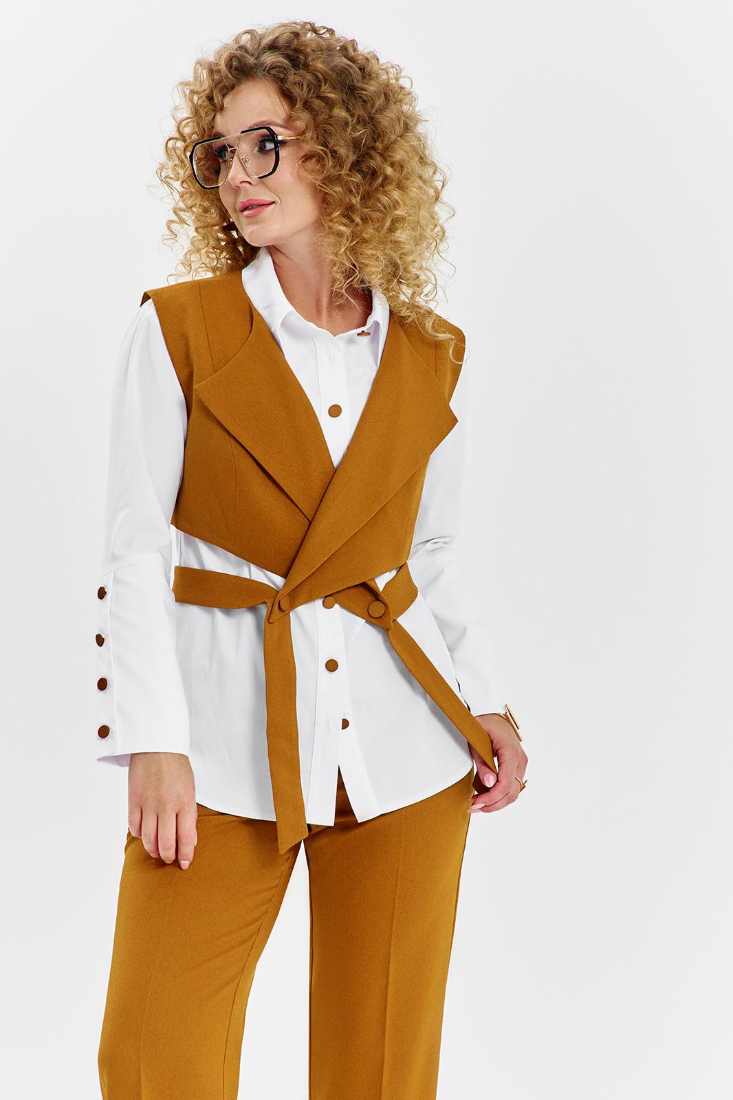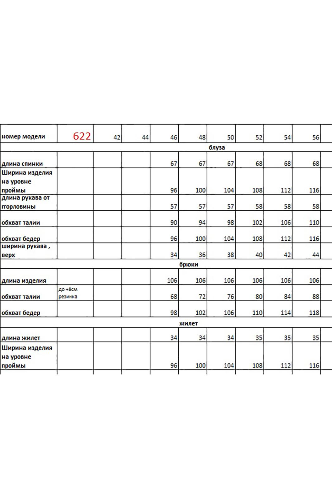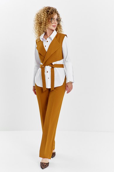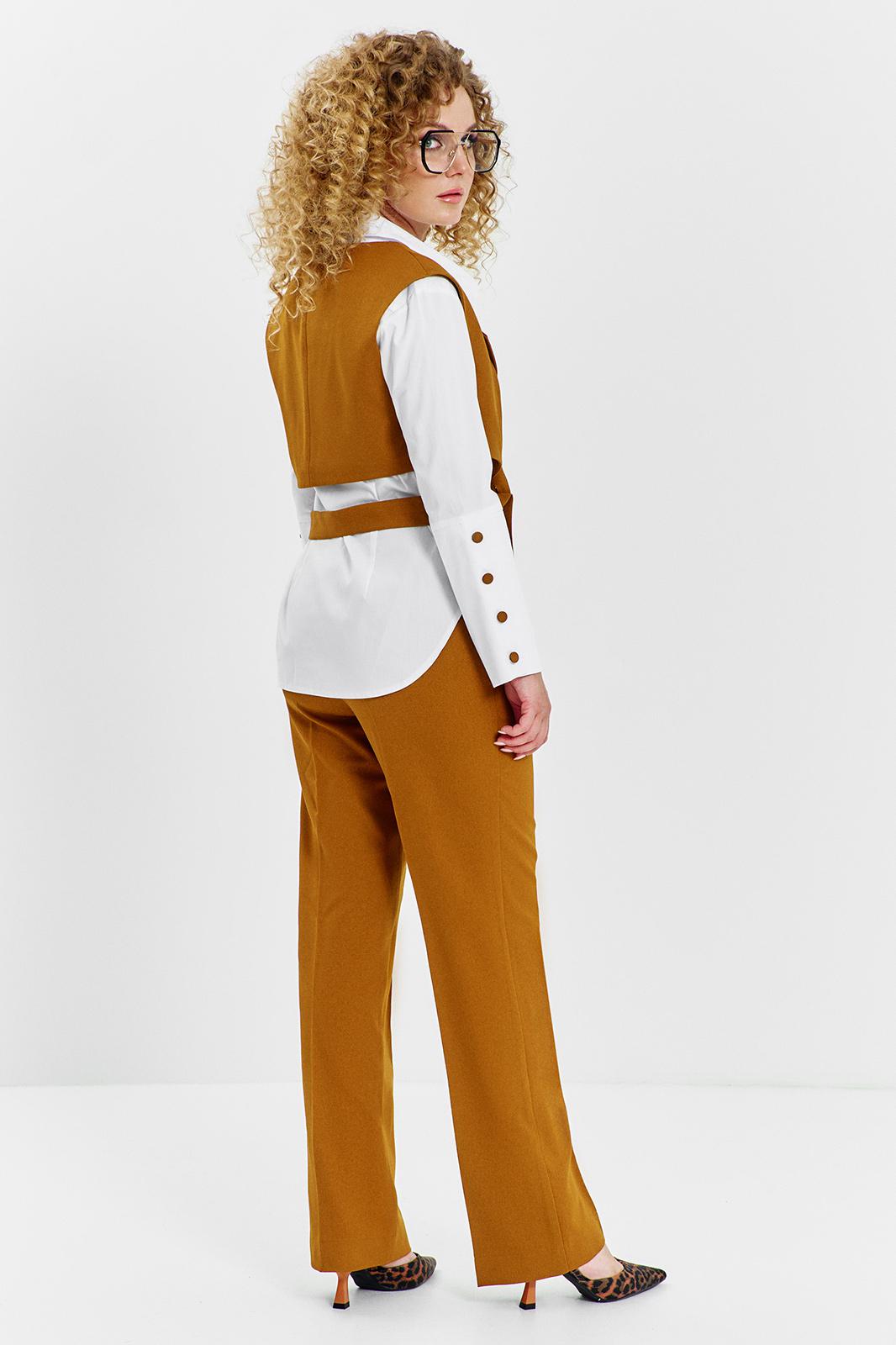 Костюм женский 3х предметный состоит тз брюк блузы и жилета, блуза выполнена из хлопковой ткани, полуприлегающего кроя , горловина воротник на стойке, рукав втачной с высокой манжетой по низу рукава, застежка - планка с петлей пуговицей, низ фигурный. Жилет свободного кроя, укороченный, воротник отложной с лацканами, по переду жилета съёмный пояс, с застежкой петли -пуговицы. Брюки средней посадки, прямого кроя на притачном поясе с резинкой, в боковых швах имеются карманы, застежка петля- пуговица и молния на гульфике