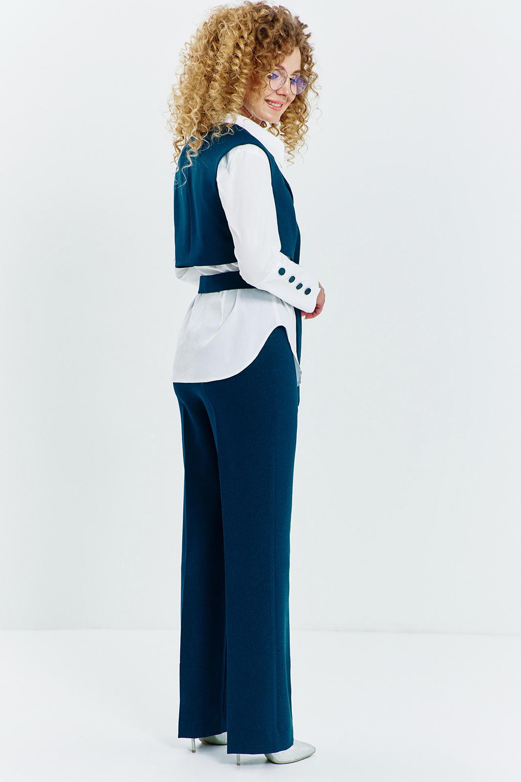 Костюм женский 3х предметный состоит тз брюк блузы и жилета, блуза выполнена из хлопковой ткани, полуприлегающего кроя , горловина воротник на стойке, рукав втачной с высокой манжетой по низу рукава, застежка - планка с петлей пуговицей, низ фигурный. Жилет свободного кроя, укороченный, воротник отложной с лацканами, по переду жилета съёмный пояс, с застежкой петли -пуговицы. Брюки средней посадки, прямого кроя на притачном поясе с резинкой, в боковых швах имеются карманы, застежка петля- пуговица и молния на гульфике