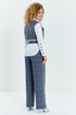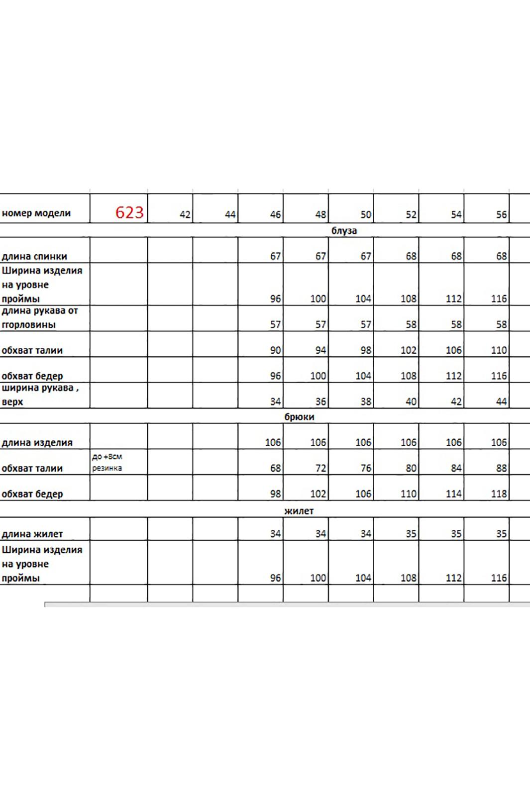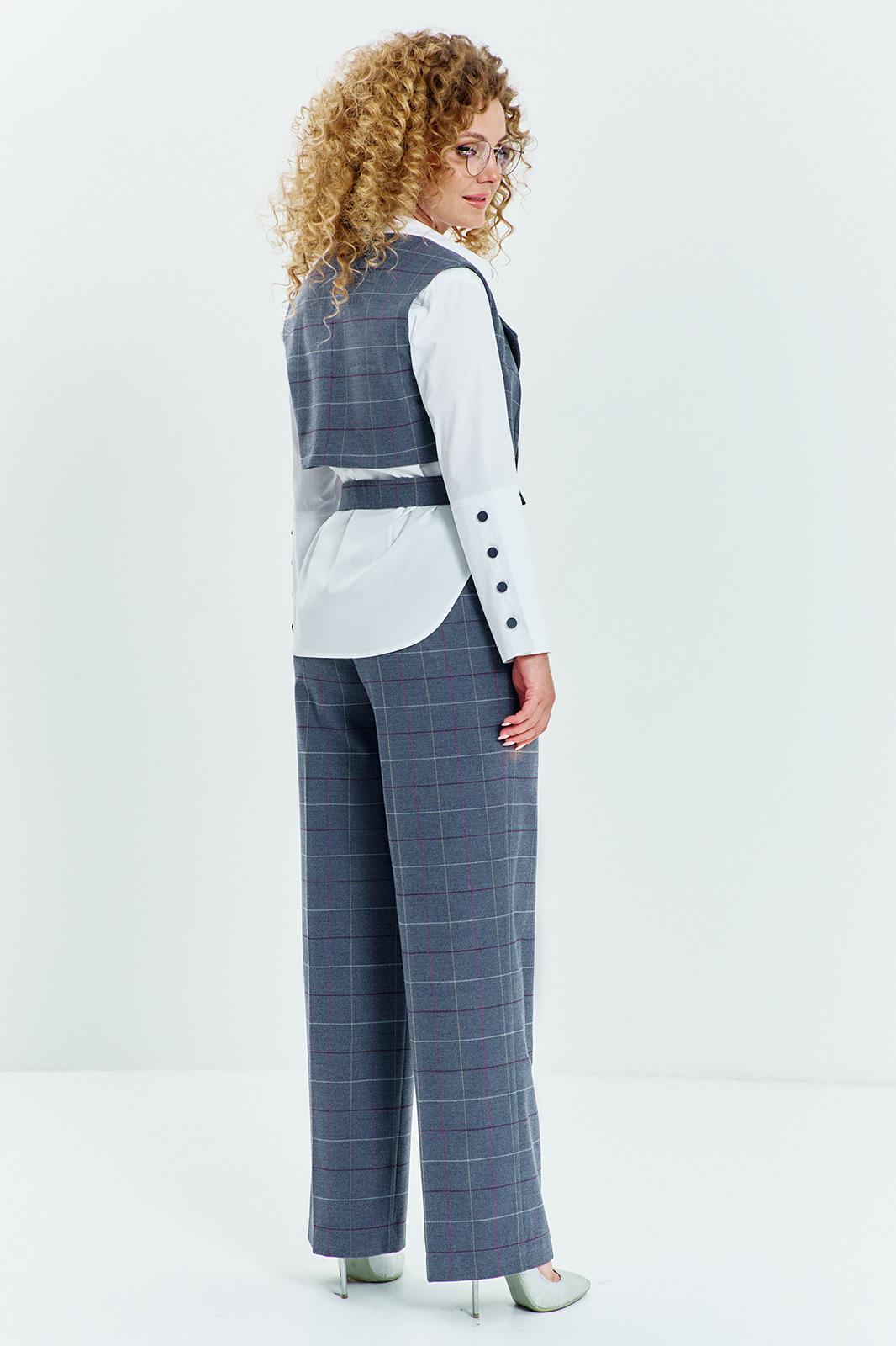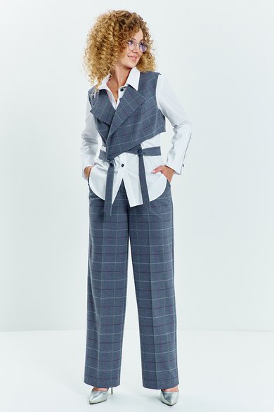 Костюм женский 3х предметный состоит тз брюк блузы и жилета, блуза выполнена из хлопковой ткани, полуприлегающего кроя , горловина воротник на стойке, рукав втачной с высокой манжетой по низу рукава, застежка - планка с петлей пуговицей, низ фигурный. Жилет свободного кроя, укороченный, воротник отложной с лацканами, по переду жилета съёмный пояс, с застежкой петли -пуговицы. Брюки средней посадки, прямого кроя на притачном поясе с резинкой, в боковых швах имеются карманы, застежка петля- пуговица и молния на гульфике.