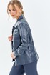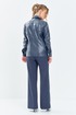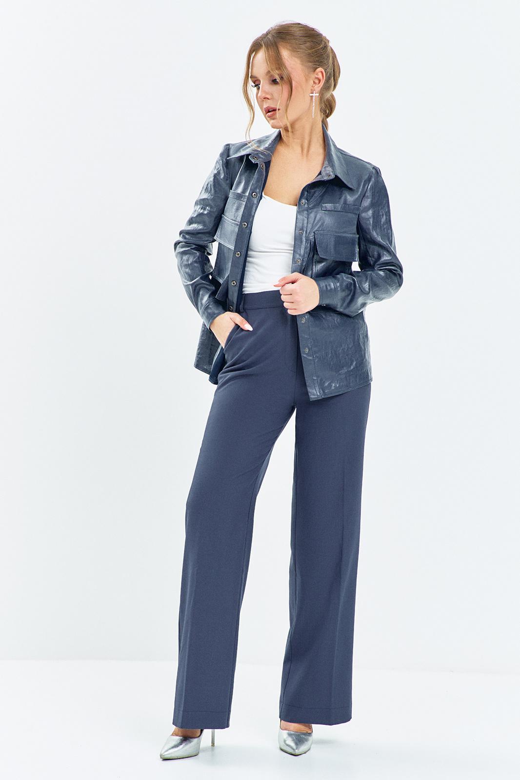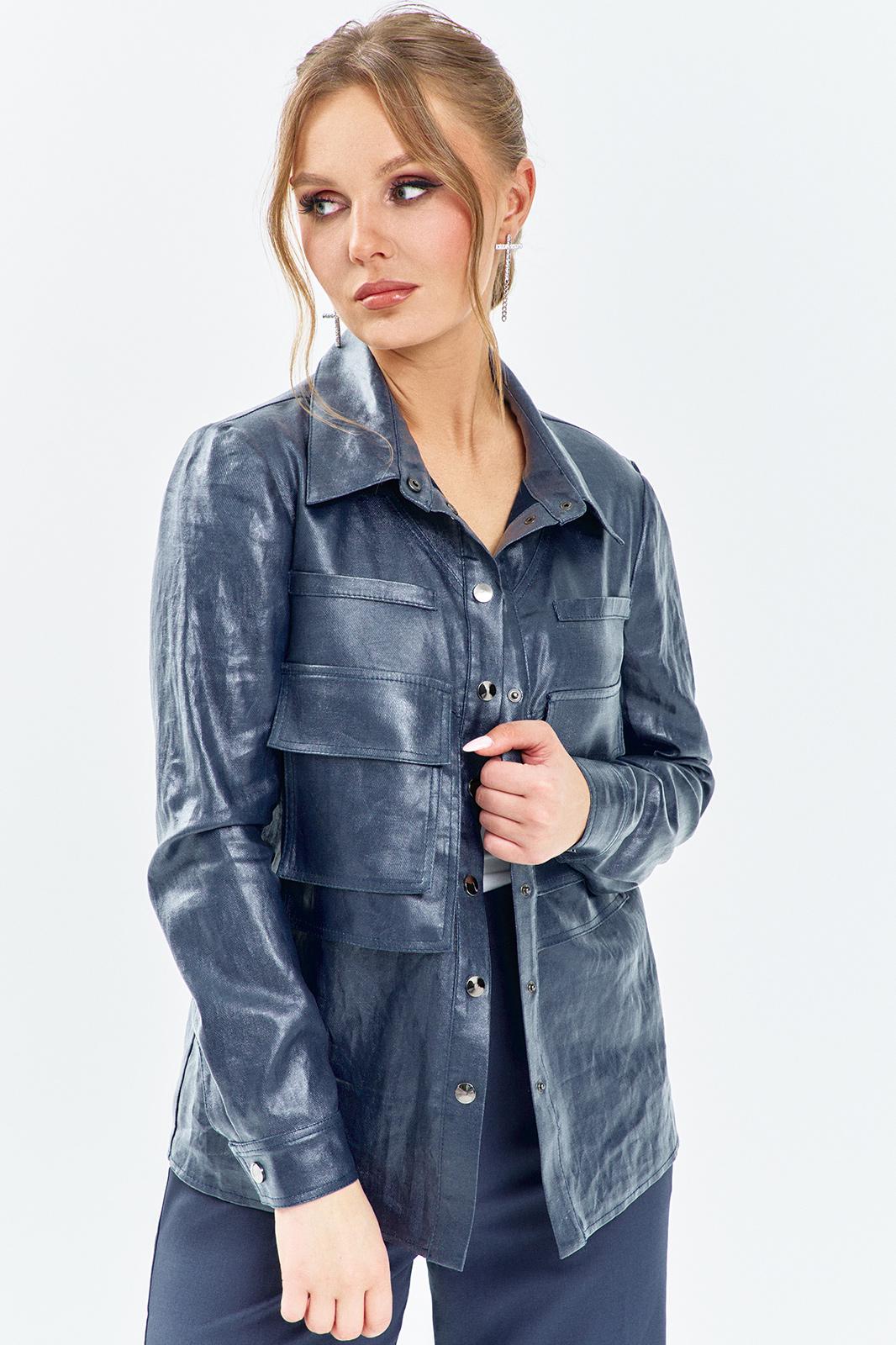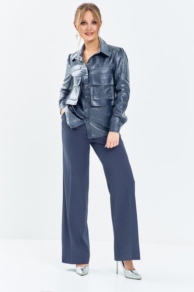 Костюм 2х предметный, состоит из рубашки и брюк. Выполнен из сочетания льна с напылением и костюмной ткани. Рубашка из льна прямого кроя без подкладки, по полочке расположены накладные декоративные элементы и карманы с клапаном. спинка с отрезной кокеткой и таллиевыми выточками. Воротник отложной на стойке, рукав втачной 7/8. Брюки из костюмной ткани прямого кроя, завышенной посадки, на притачном поясе , в боковых швах расположены карманы, застёжка молния на гульфике.
