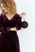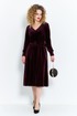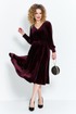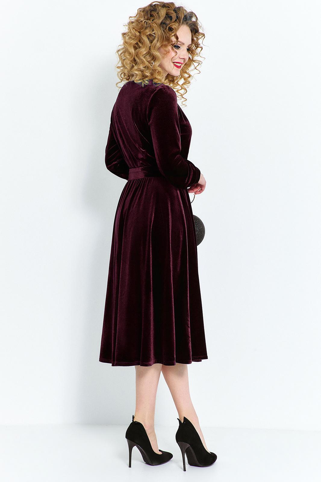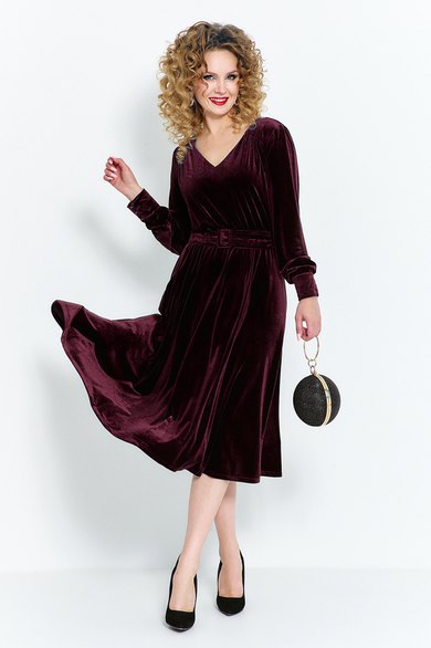 Платье женское выполнено из Велюра в романтическом стиле, изделие отрезное по линии талии. Лиф платья с отрезными кокетками по плечам и V-образным вырезом. Рукав длинный на широкой манжете по низу (застёжка пуговицы с навесными петельками). Юбка изделия А-Образного кроя. В таллиевом шве расположена резинка. В комплект входит пояс.