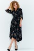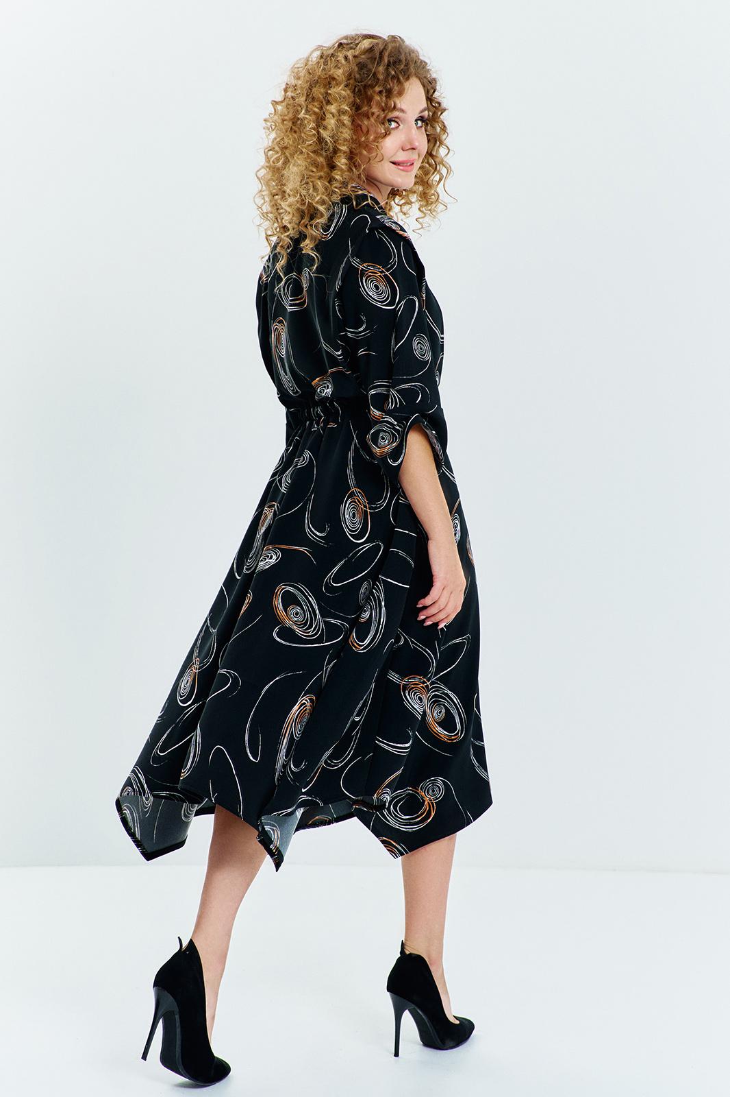 Платье женское выполнено в романтичном стиле, полуприлегающего кроя. Изделие отрезное по линии талии с регулирующей эластичной лентой в талии. Лиф платья свободного кроя с декоративными защипами и заложенными складками по талии и плечам. Рукав втачной приспущенный широкий с манжетой по низу. Юбка полусолнце с ассиметричным низом, в боковых швах юбки расположены фигурные карманы.