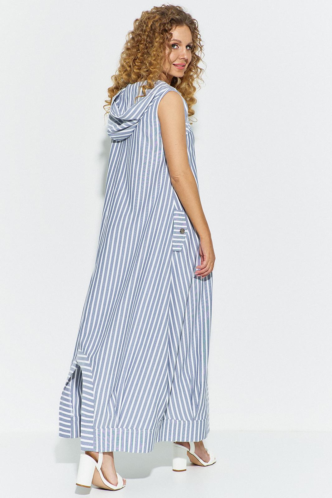 Сарафан женский выполнен из ткани лен-вишер. По полочке выполнены декоративные разрезы. Центр переда разрезной с функционально молнией по горловине. В боковых швах карманы декорированные клапанами. Низ изделия фигурный. Спинка разрезная, Изделие с капюшоном. Длина изделия по центру спинки 102 см, длина изделия по боку от плеча 131 см