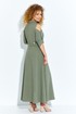 Платье полуприлегающего силуэта выполнено из льна-вишера. Воротник - отложная стойка. Рукав втачной - спущенный 3/4 с декоративными патами. Изделие отрезное по линии талии. Юбка изделия А-силуэта. В боковых швах функциональные карманы с клапаном. Застежка-молния.