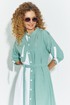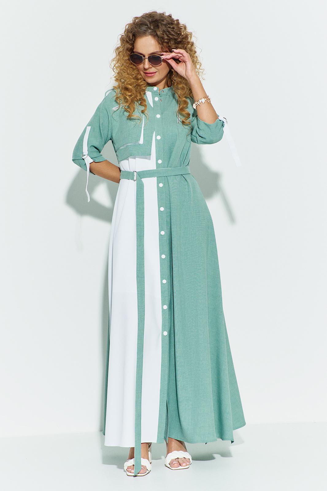 Платье женское свободного кроя выполнено из ткани лён-вишер, платье с планкой по переду и застежкой кнопки. На груди расположены накладные декоративные элементы с молниями. Рукав втачной, горловина стойка, по боковым швам от низа разрезы.