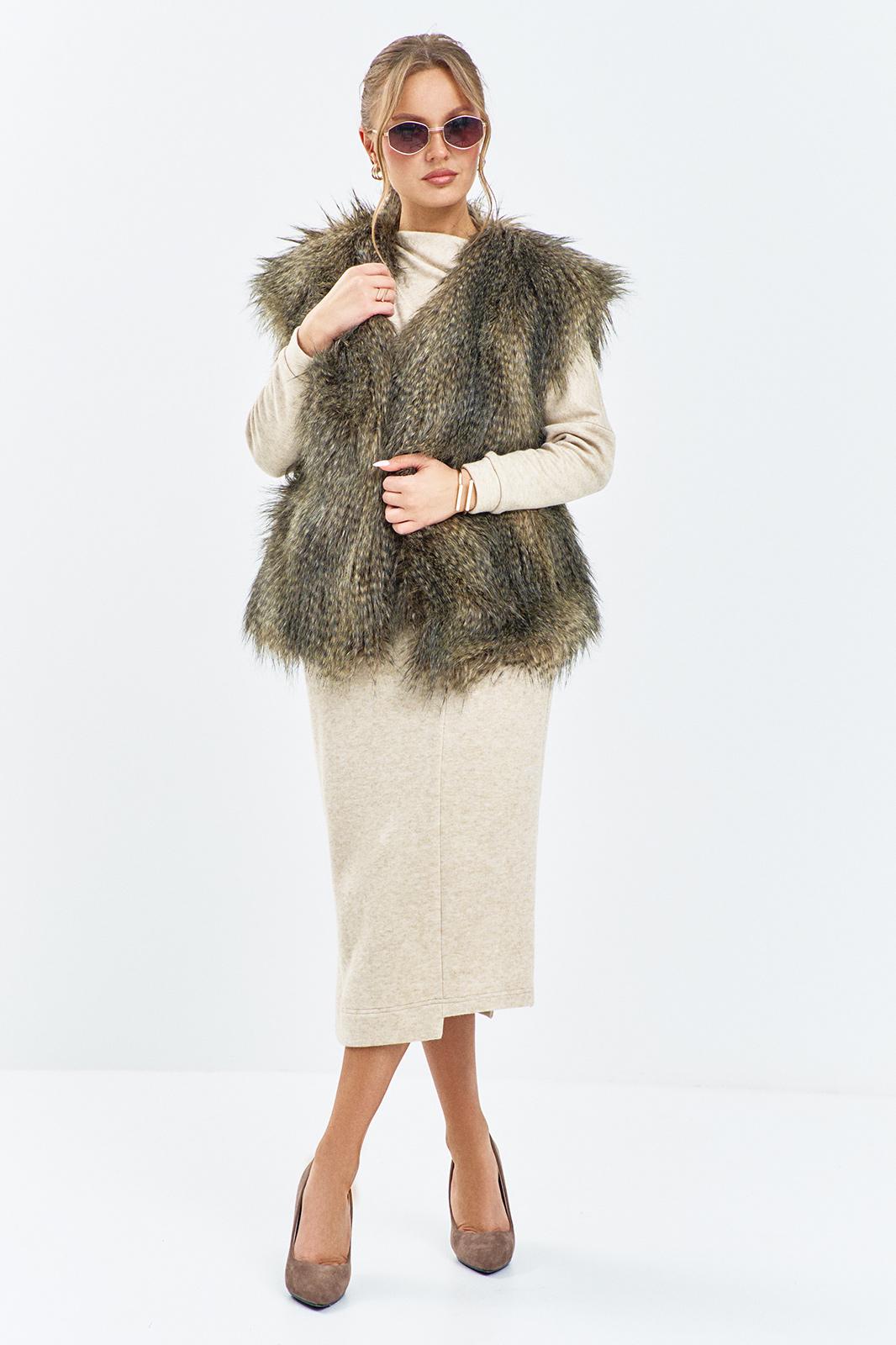 Жилет женский из меха. Жилет женский выполнен из искусственного меха, горловина V- образная, изделие наплной подкладке, по переду крючек-застежка.
