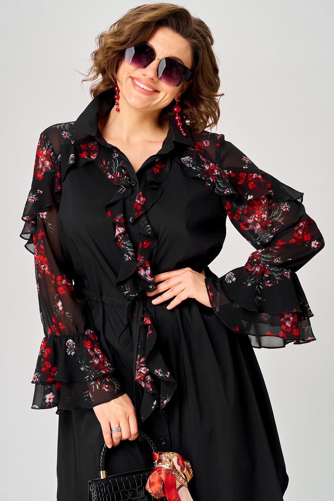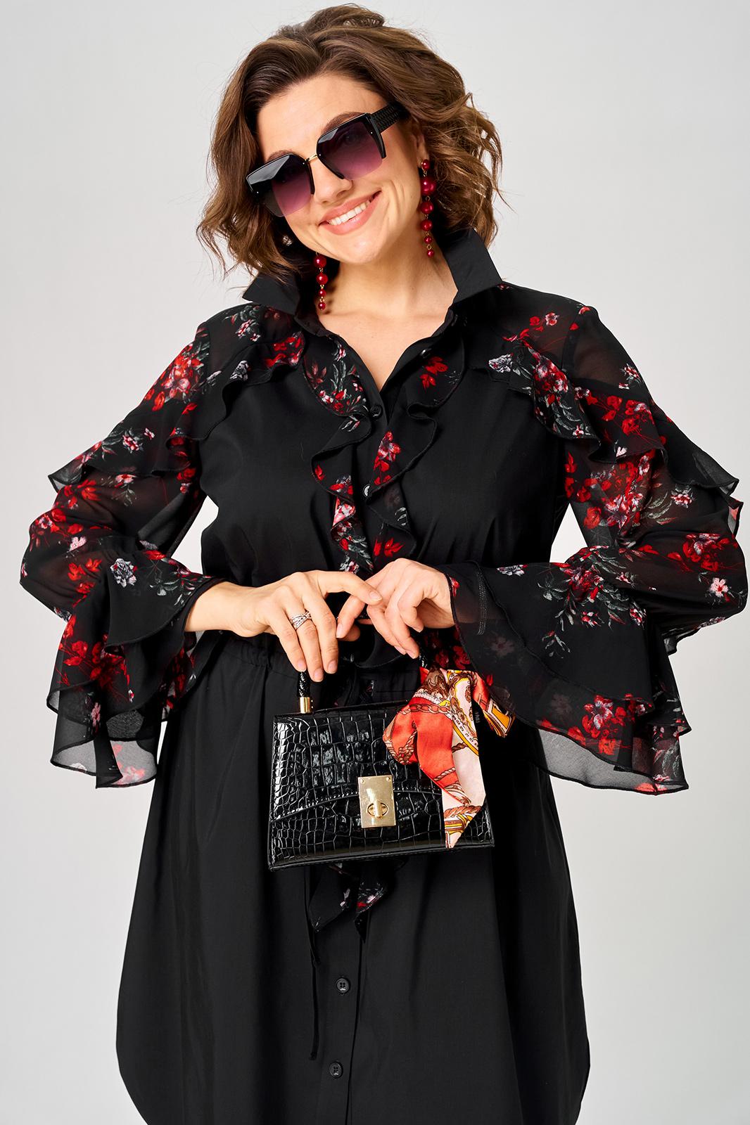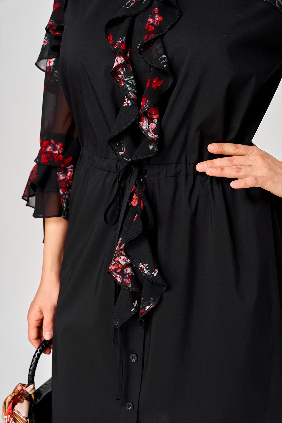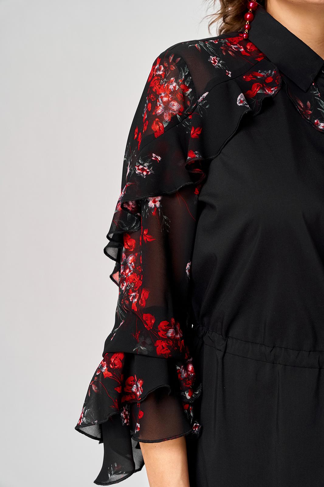 Платье женское шикарное стильное нарядно повседневное прямого силуэта. Выполнено из хорошего хлопка в сочетании с красивым легким воздушным принтованным шифоном. Вырез горловины воротник на стойке рубашечного типа, застежка доверху на обметанные петли и пуговицы, что дает возможность регулировать глубину декольте. Рукав втачной по низу на притачной манжете из двух воланов. По талии втянута кулиса с помощью которой регулируется желаемый размер талии и скрадываются все недостатки. Низ платья в стильном современном дизайне - фигурный. В боковых швах обработаны небольшие разрезы. Декором платья служат очень красивые воланы из шифона.