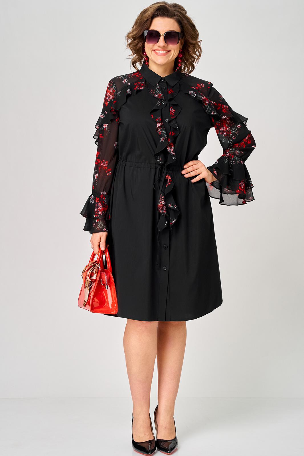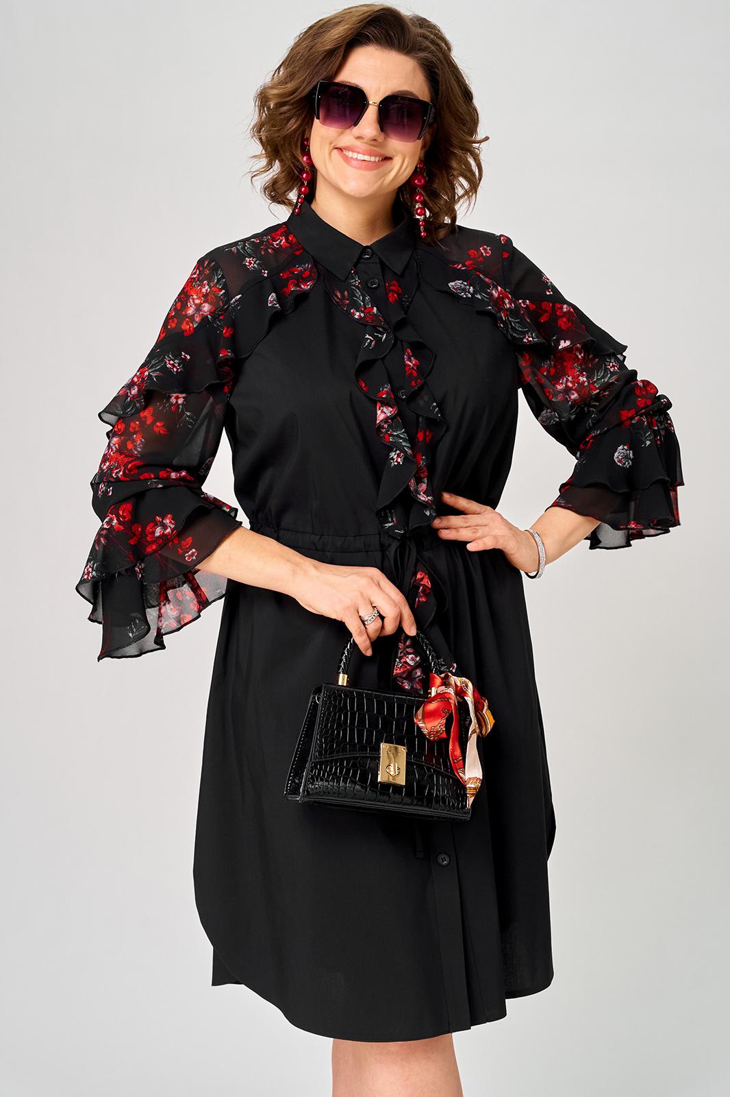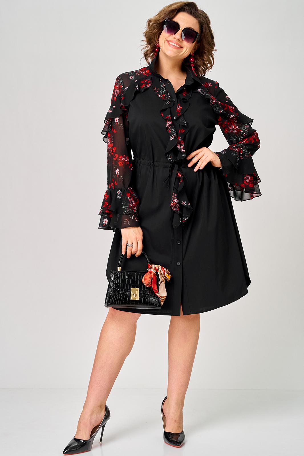 Платье женское шикарное стильное нарядно повседневное прямого силуэта. Выполнено из хорошего хлопка в сочетании с красивым легким воздушным принтованным шифоном. Вырез горловины воротник на стойке рубашечного типа, застежка доверху на обметанные петли и пуговицы, что дает возможность регулировать глубину декольте. Рукав втачной по низу на притачной манжете из двух воланов. По талии втянута кулиса с помощью которой регулируется желаемый размер талии и скрадываются все недостатки. Низ платья в стильном современном дизайне - фигурный. В боковых швах обработаны небольшие разрезы. Декором платья служат очень красивые воланы из шифона.